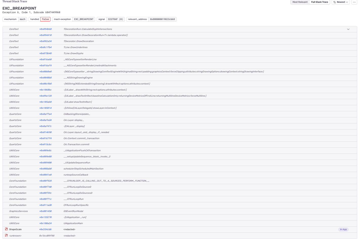I'm attaching 2 screenshots, from the crashing stacktrace, one from Sentry and the other one from Xcode crash reporter directly. Also, attached the .crash file with the full stacktrace that can be found at Xcode.