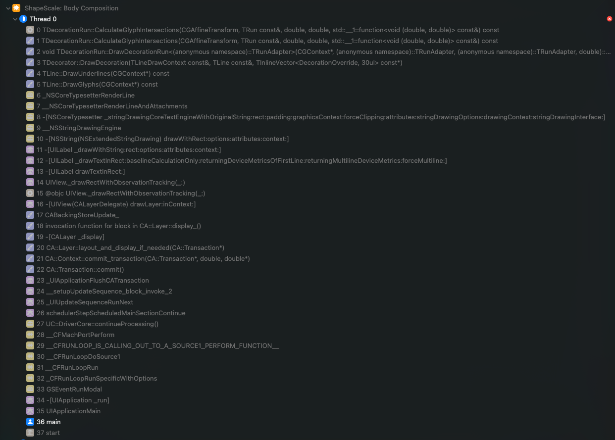 0 CoreText TDecorationRun::CalculateGlyphIntersections(CGAffineTransform, TRun const&, double, double, std::__1::function<void (double, double)> const&) const + 1704 1 CoreText TDecorationRun::CalculateGlyphIntersections(CGAffineTransform, TRun const&, double, double, std::__1::function<void (double, double)> const&) const + 1440 2 CoreText void TDecorationRun::DrawDecorationRun<(anonymous namespace)::TRunAdapter>(CGContext*, (anonymous namespace)::TRunAdapter, (anonymous namespace)::TRunAdapter, double)::'lambda'(CGPoint, CGPoint)::operator()(CGPoint, CGPoint) const + 508 3 CoreText TDecorator::DrawDecoration(TLineDrawContext const&, TLine const&, TInlineVector<DecorationOverride, 30ul> const*) + 2356 4 CoreText TLine::DrawUnderlines(CGContext*) const + 104 5 CoreText TLine::DrawGlyphs(CGContext*) const + 292