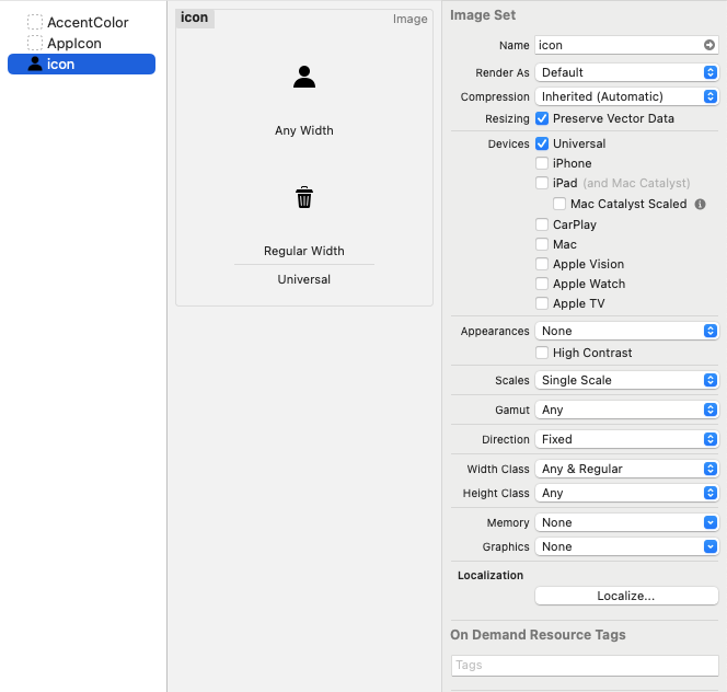 I have an Asset Catalogue configured with an image that has variants for "Any" width size class and "Regular" width size class.