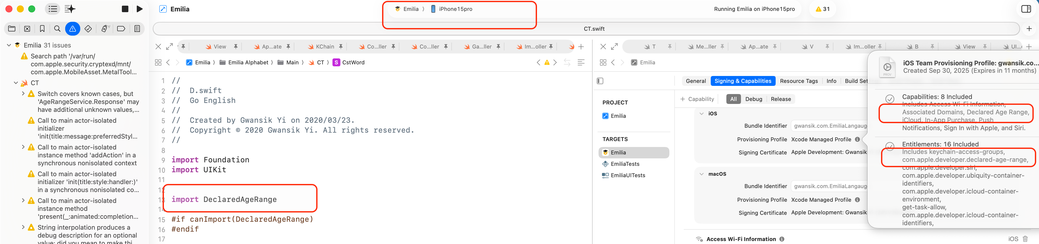 - Added the Declared Age Range capability in Signing & Capabilities for iOS target → works fine.