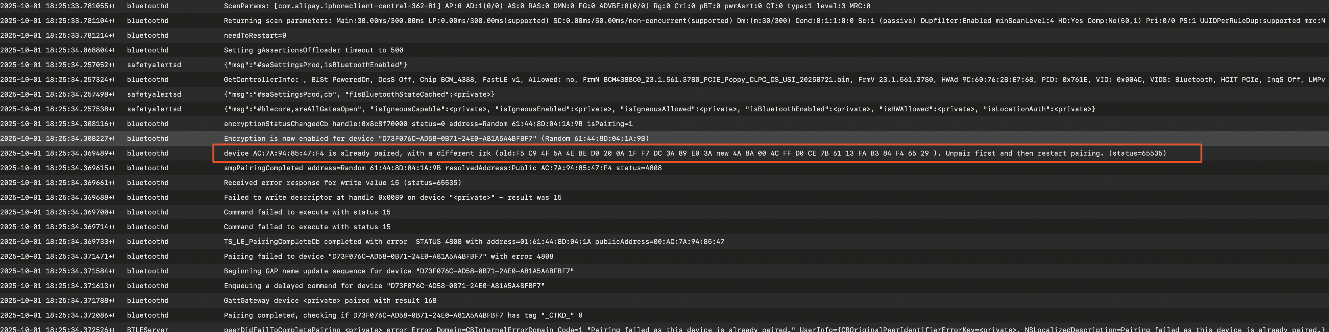 [sysdiagnose_2025.10.01_18-29-27+0800_iPhone-OS_iPhone_23A341] I got sysdiagnose from my app user.He can't pair his bluetooth peripheral. in the sysdiagnose,I found this: device AC:7A:94:85:47:F4 is already paired, with a different irk (old:F5 C9 4F 5A 4E BE D0 20 0A 1F F7 DC 3A 89 E0 3A new 4A 8A 00 4C FF D0 CE 7B 61 13 FA B3 84 F4 65 29 ). Unpair first and then restart pairing. (status=65535) but there is no device in his iphone's SYSTEM BLUETOOTH PREPHERAL LIST. I don't know how to delete the irk info when you can't find it in SYSTEM BLUETOOTH PREPHERAL LIST.