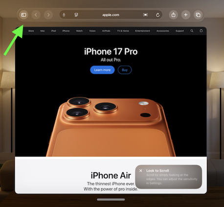 I like the toolbar visionOS's Safari uses for back & forward page, share, etc. It floats above the window.