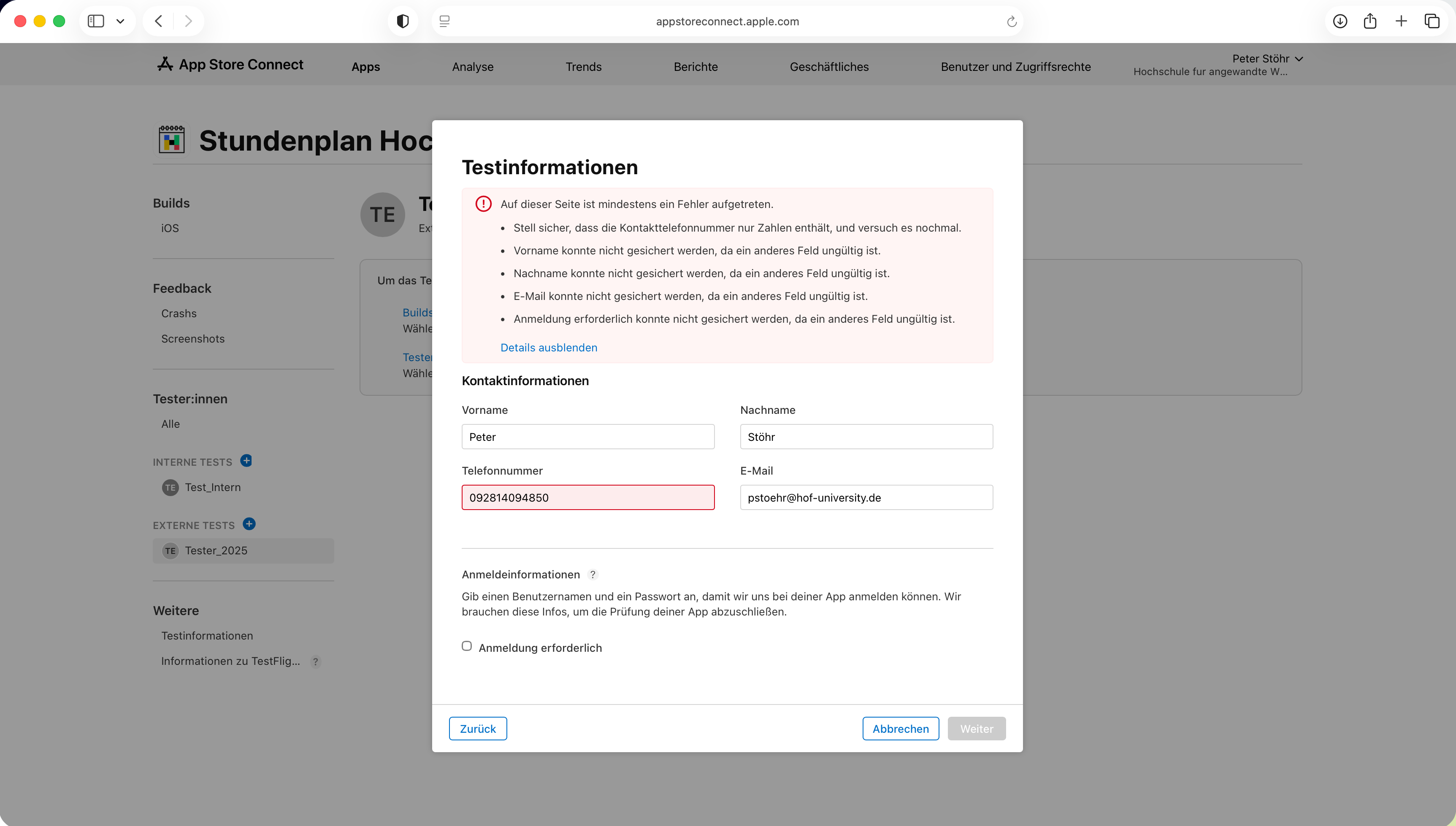 I'm trying to add a build for external testers. Everything work fine up to the point where I have to provide the information about the contact person. Entring the phone number always results in an error message that the phone number can only consits of numbers (what it really does).