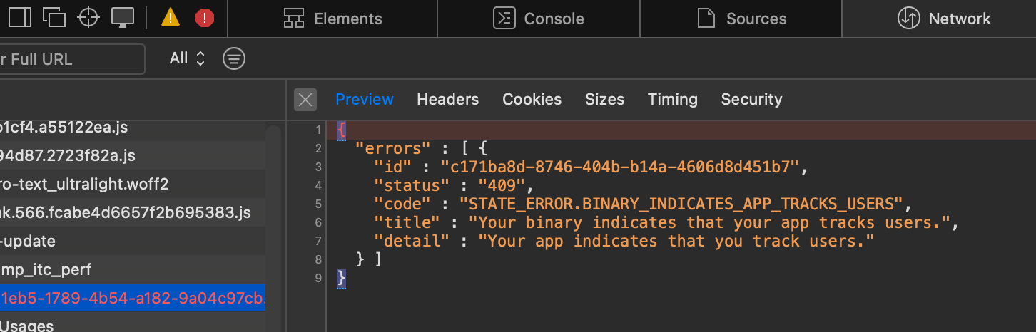 I am unable to change my App Tracking Transparency it provides no real error, though network traffic shows a 409 HTTP response from the backend API when trying to save. Here is a screenshot of the result when trying to save.