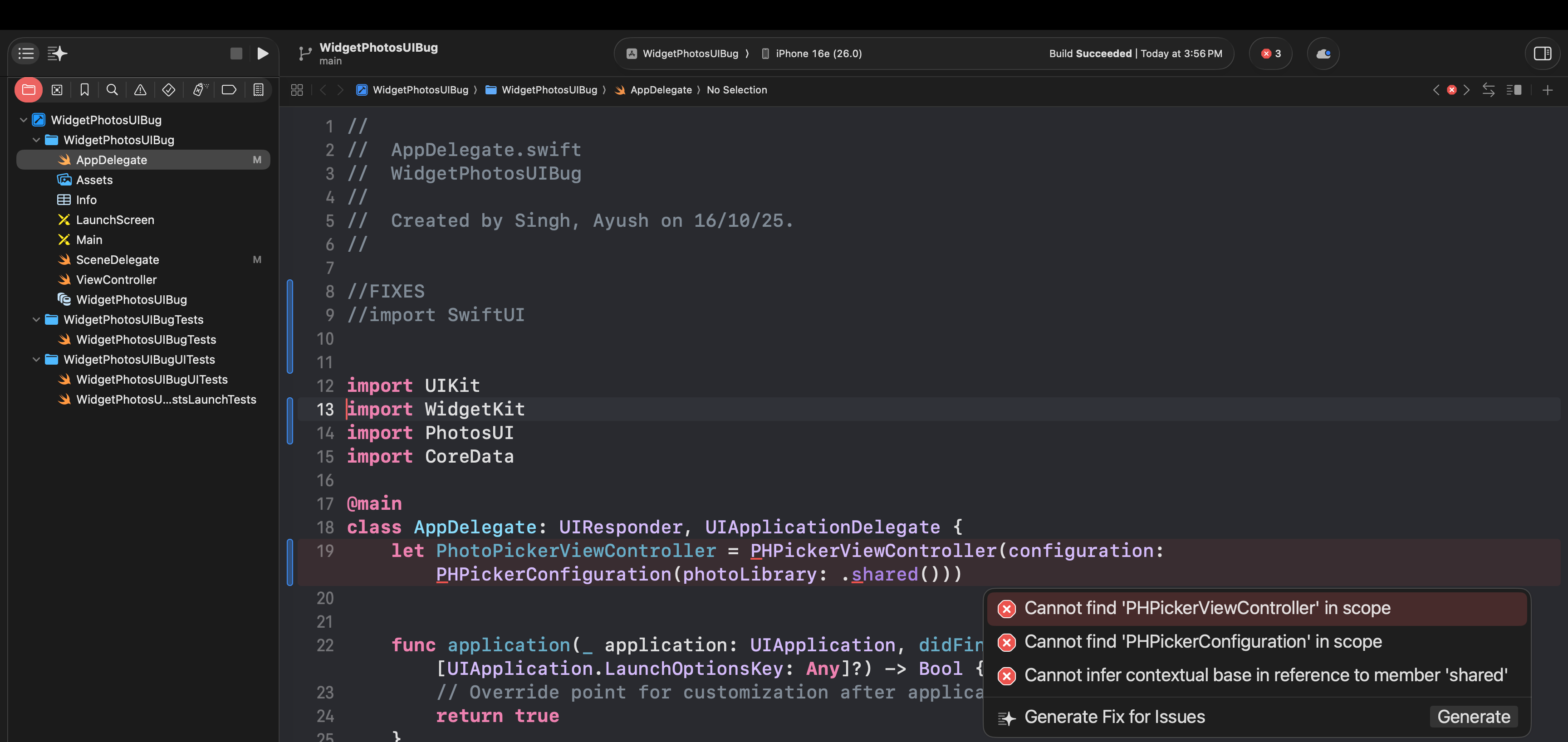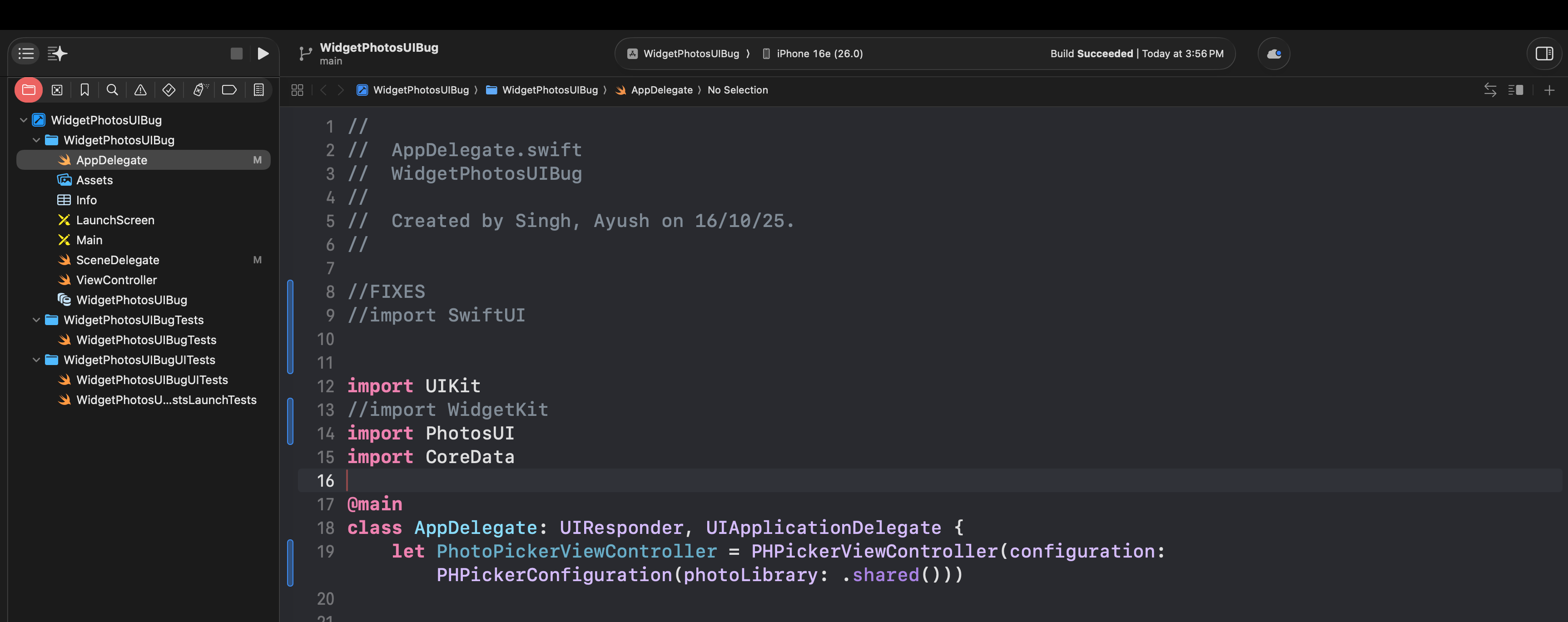 As soon as widgetKit is imported a compiler error is thrown which is PHPickerViewController is not in scope.