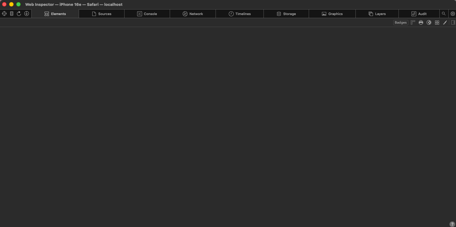 Now, the web inspector still OPENS, but it opens in a broken state. The context is available to select from Safari's "Develop" menu: Develop > "iPhone 16 Pro (Simulator)" > "localhost - login". It appears under the Safari heading if I have navigated to the web app in the browser, or under the Expo heading if I am accessing it through the webview in our React Native wrapper app. When I select it, the web inspector window does appear.