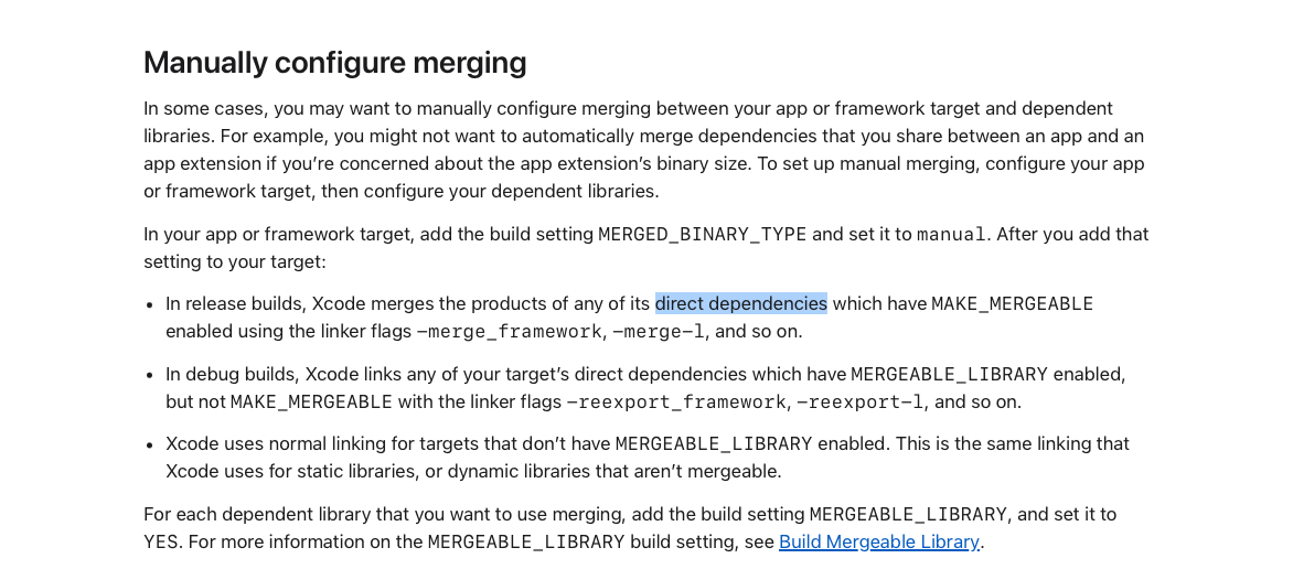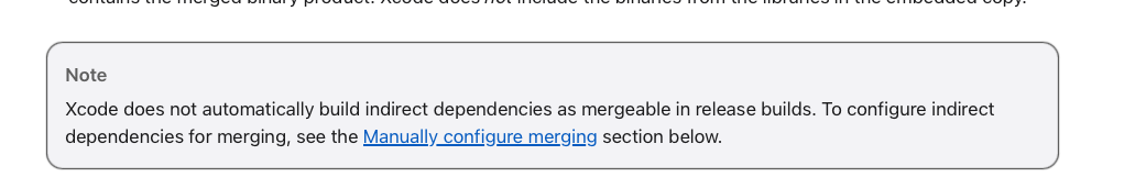 Hello. On my app I have the necessity to use mergeable libraries, in my context my libraries are indirect dependency, in other words the dependency isn’t target in my project, and they are XCFramework where they are imported on Framework, Libraries, and Embedded Content session on my app target.