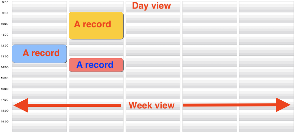 I wrote a SwiftUI based app which does use a layout similar to a calendar. A week view with 5 day-views. Each day view may contain several record views. I've implemented a drag for the records which works well inside a day view (up and down) but I can't get it working between the days. Here is an example how it looks: