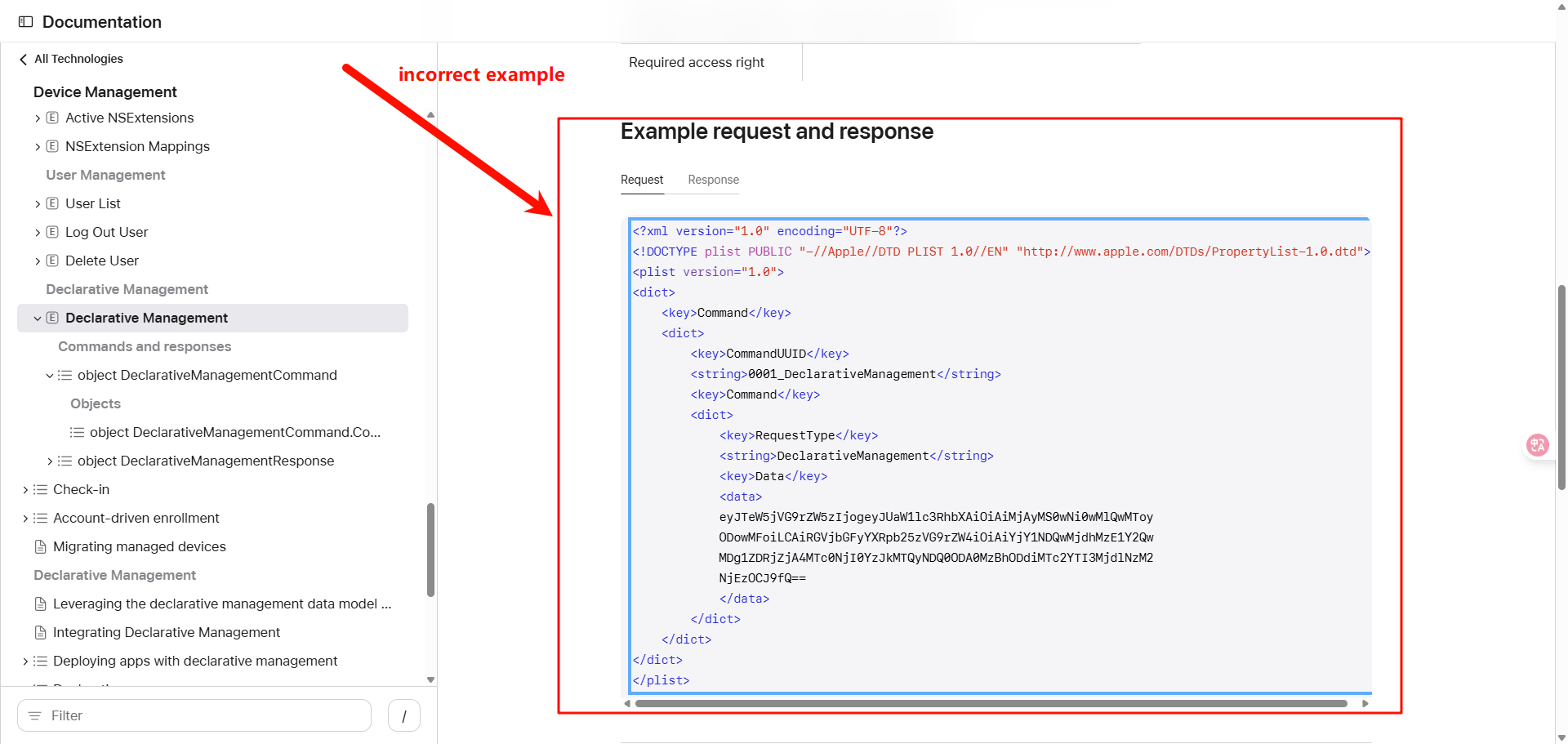I'm writing to point out a potential structural error in an example of the DeclarativeManagement command. This could cause significant confusion for developers implementing the MDM protocol.