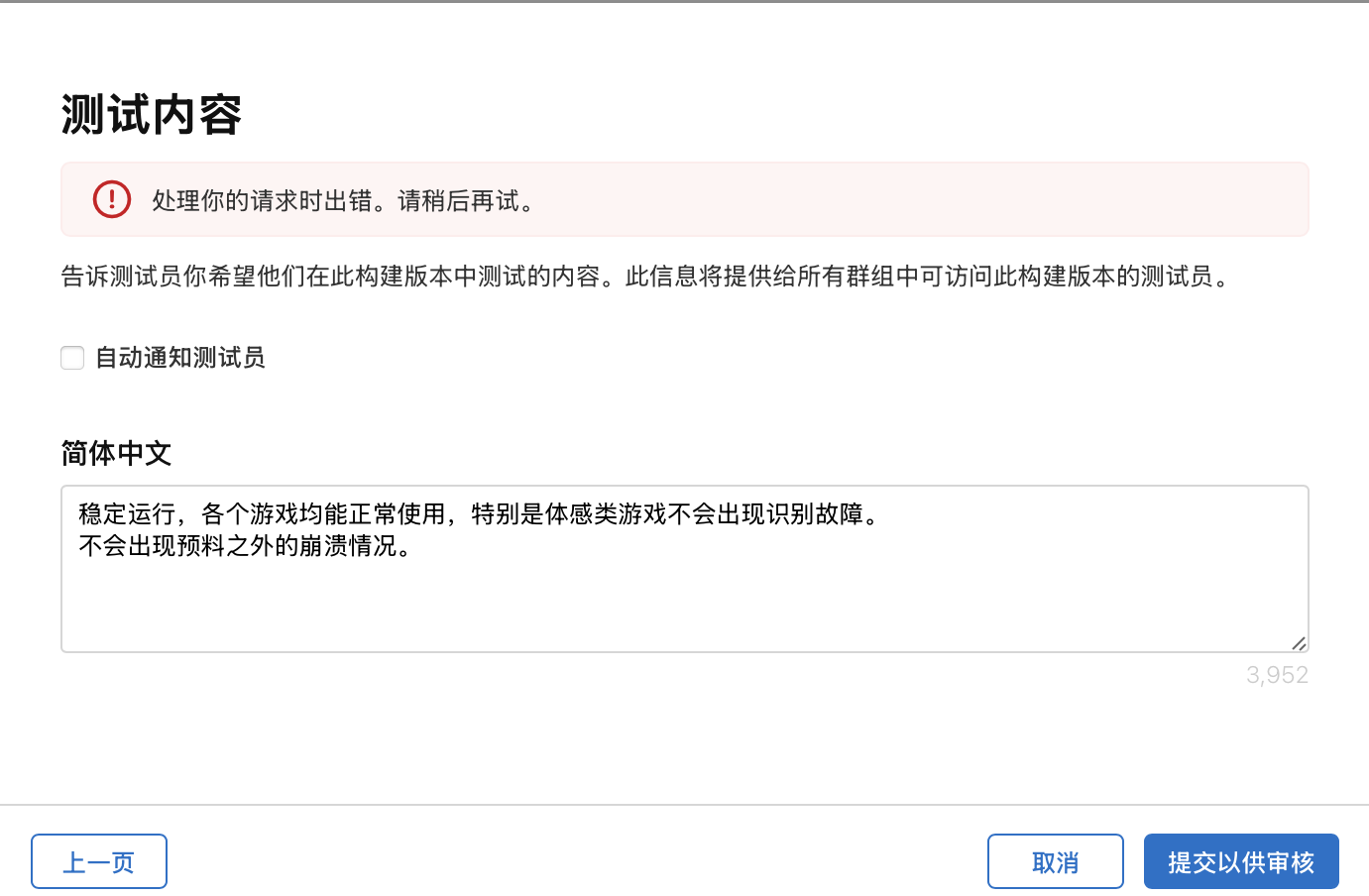 When I try to add the external test group to the current version of the test group, there is an error in processing the request.