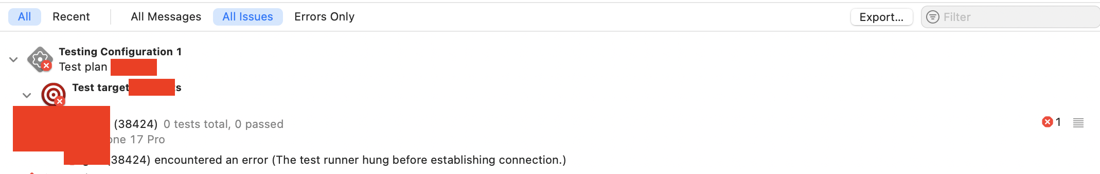 I am trying to launch tests to the simulator, and I always get this error after 300 second timeout: "encountered an error (The test runner hung before establishing connection.)"