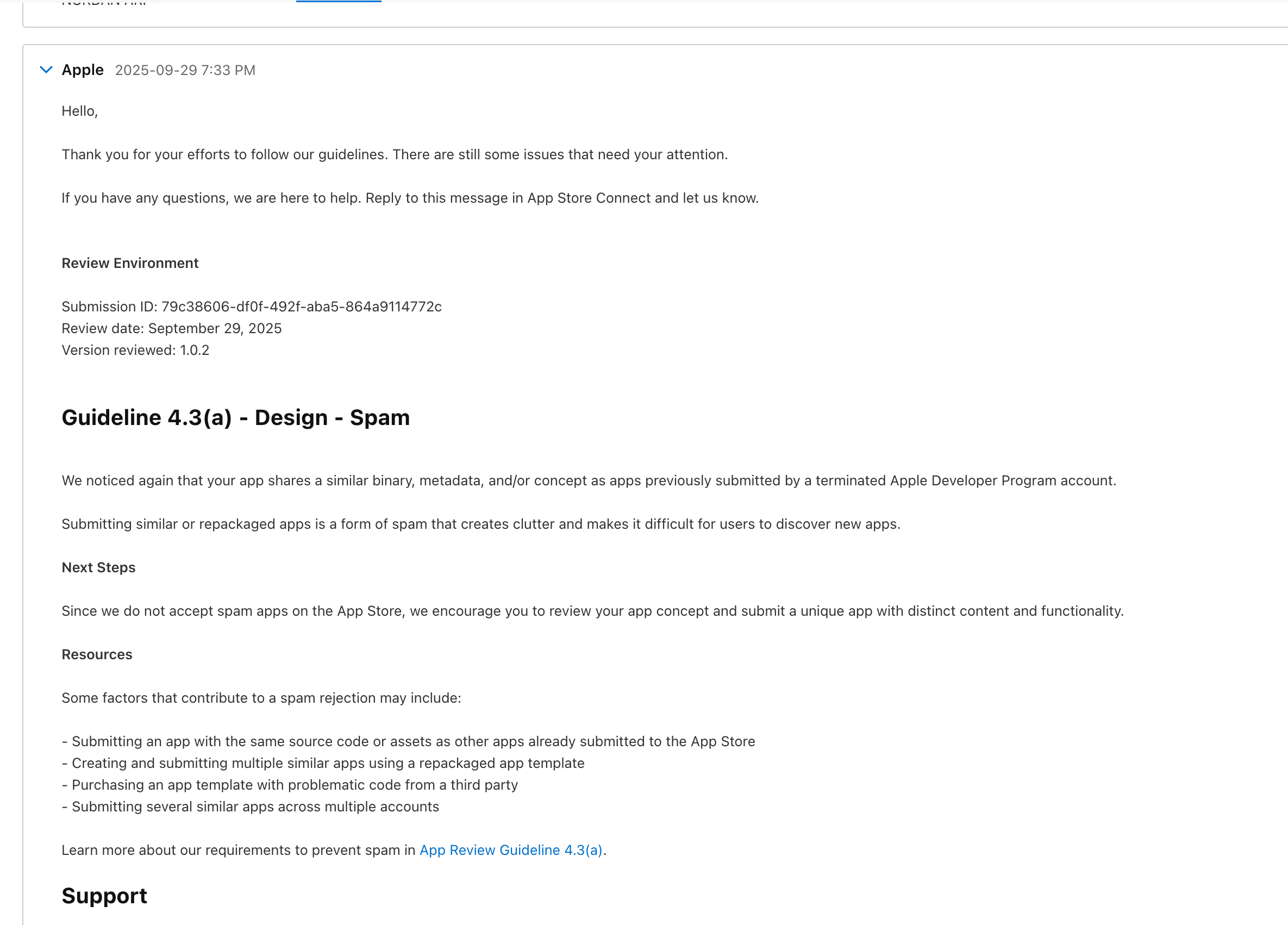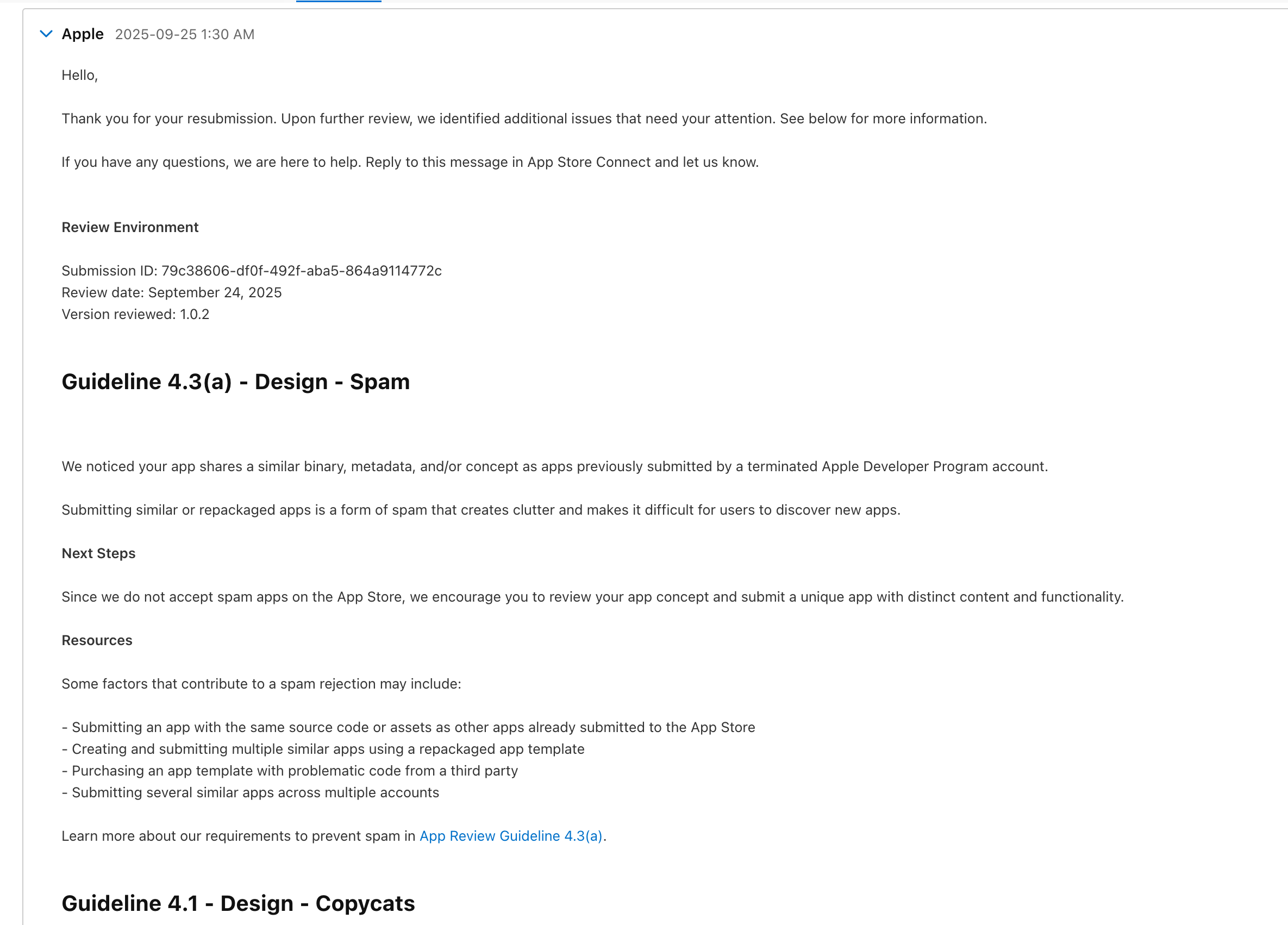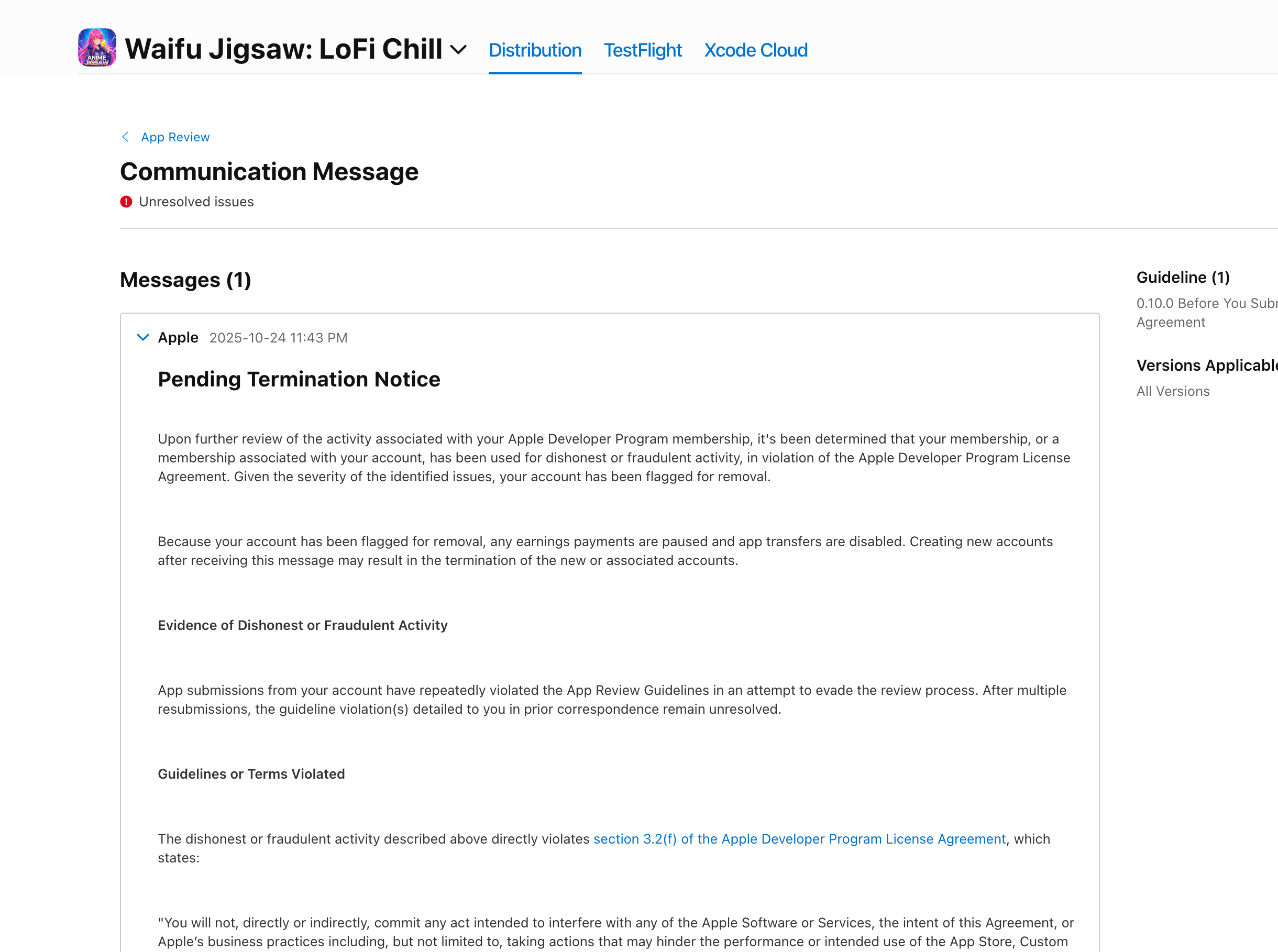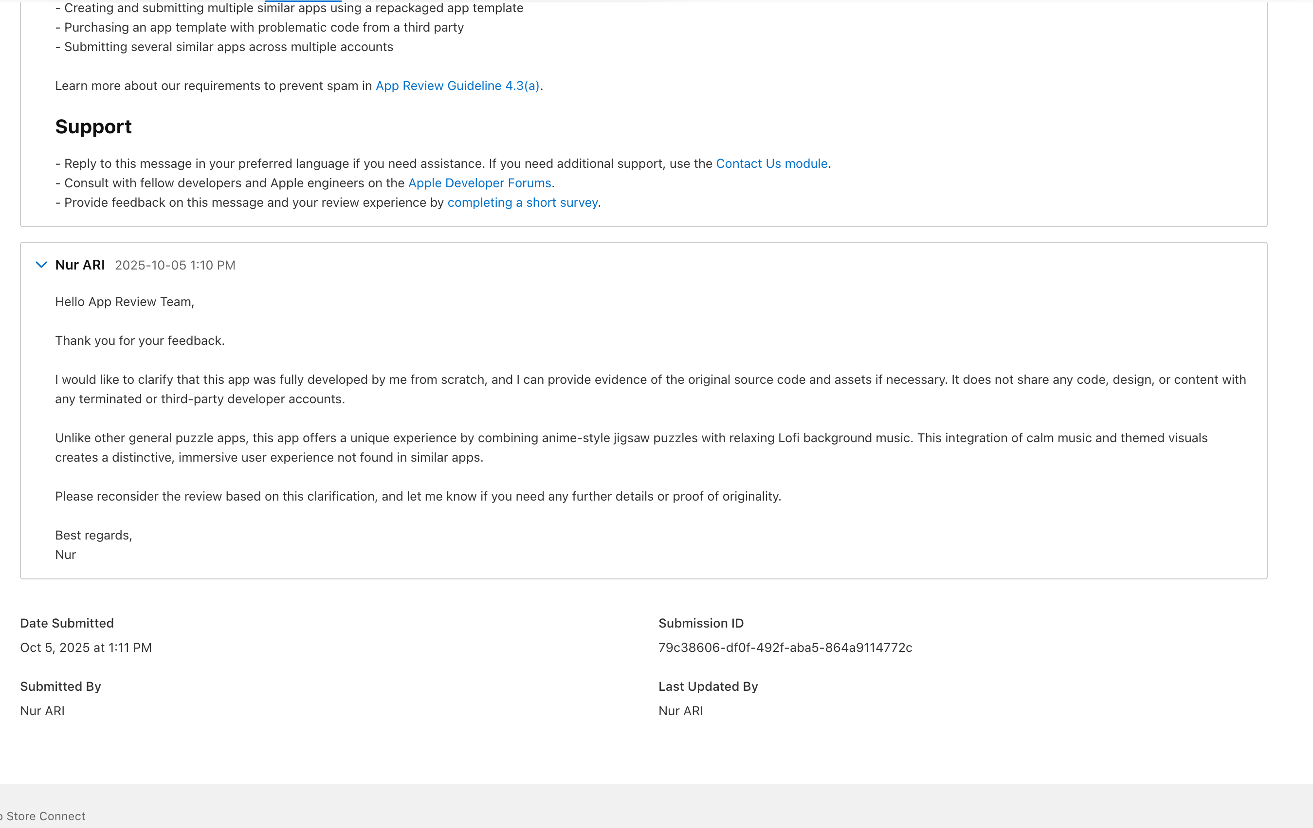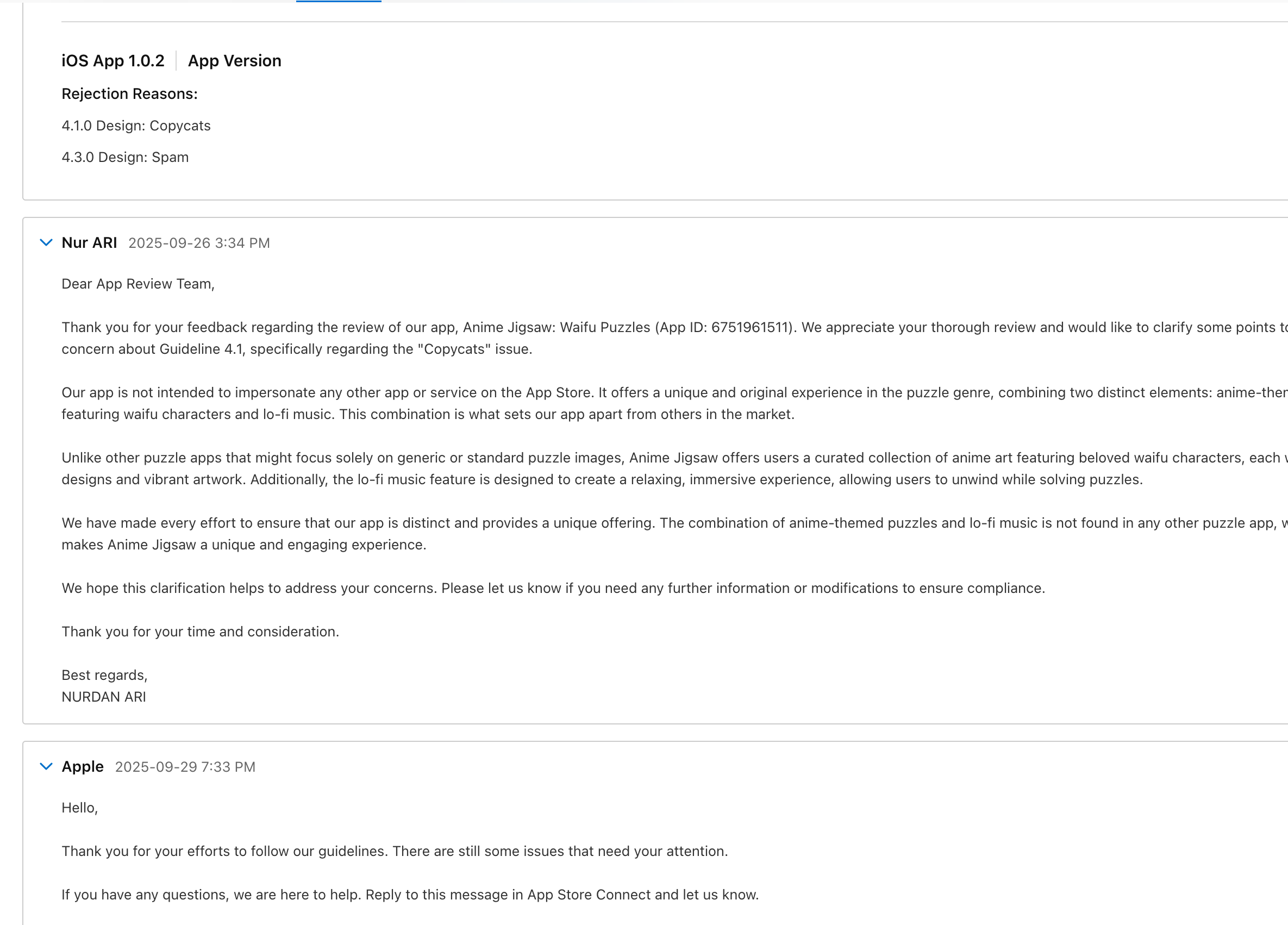 I submitted a puzzle app called “Anime Jigsaw” to App Store Connect. The App Store Connect team initially rejected the app due to minor errors. I then fixed the errors and resubmitted it, but this time they said it violated “Guideline 4.1 - Design - Copycats” and that I didn't write the code. I responded that I wrote the code and could prove it. They rejected it again, citing "Guideline 4.1 - Design - Copycats,“ and I explained that my app was different from other puzzle apps because you solve puzzles while listening to Lo-Fi music. But this time, they issued a ”Pending Termination Notice“ and started saying ”Evidence of Dishonest or Fraudulent Activity." I am definitely not a scammer. I am trying to communicate with the App Store Connect team, but they are trying to close my account and label it as “Fraudulent Activity.” Why are you doing this? How can I resolve this? My account will be closed in 30 days, and I can't communicate with anyone.
