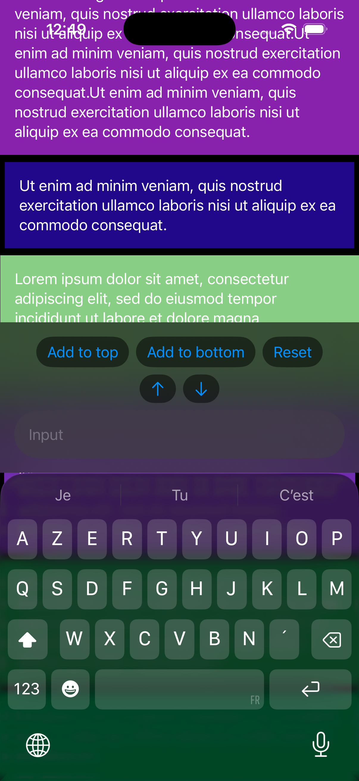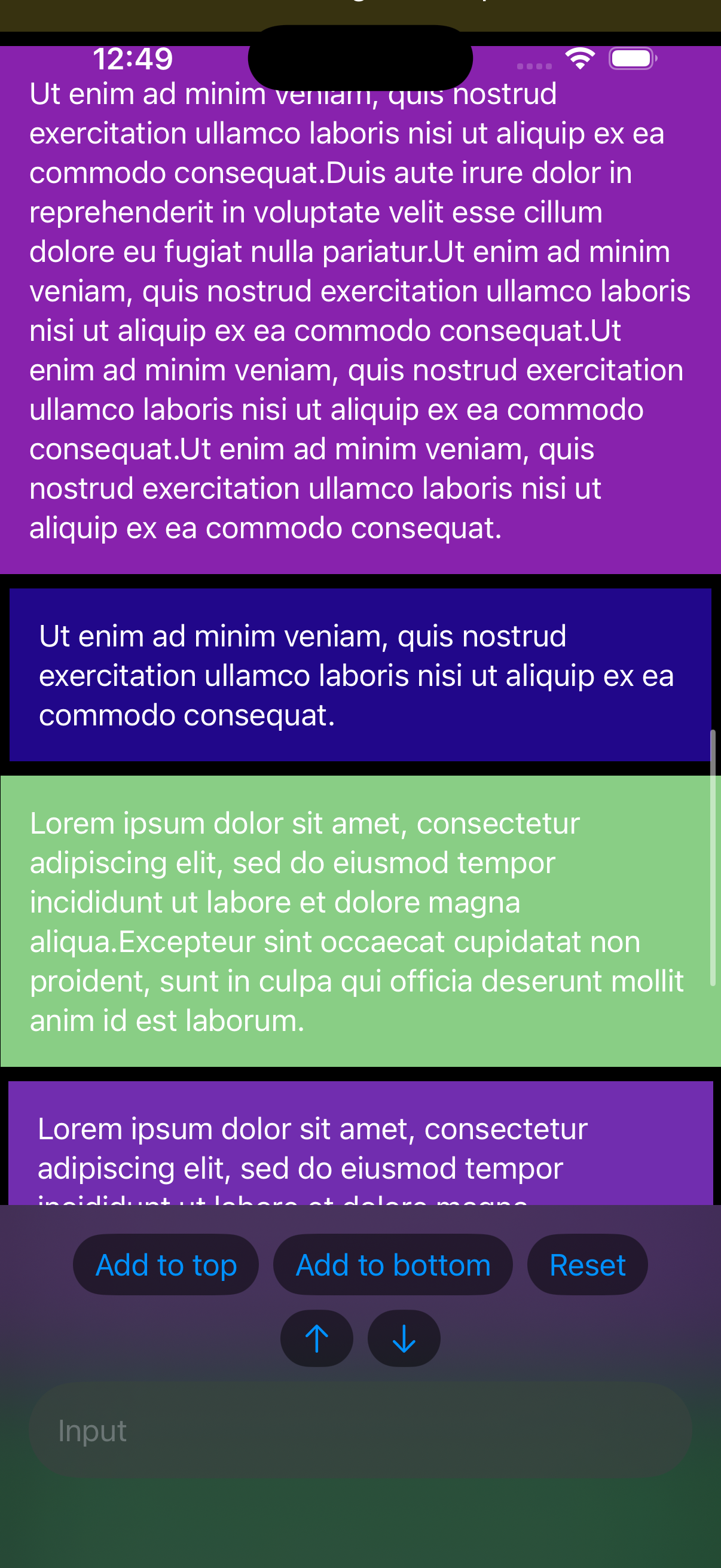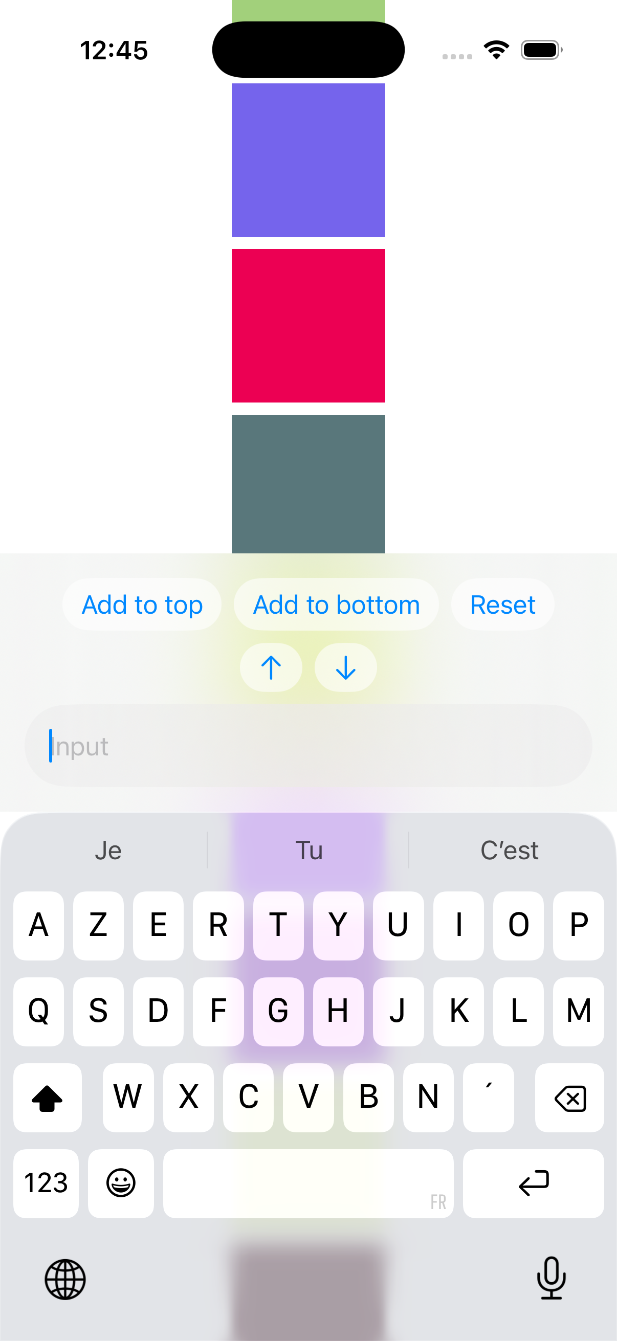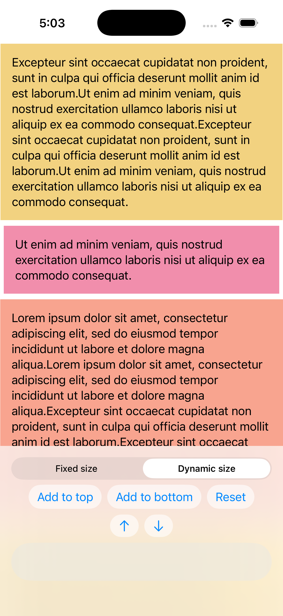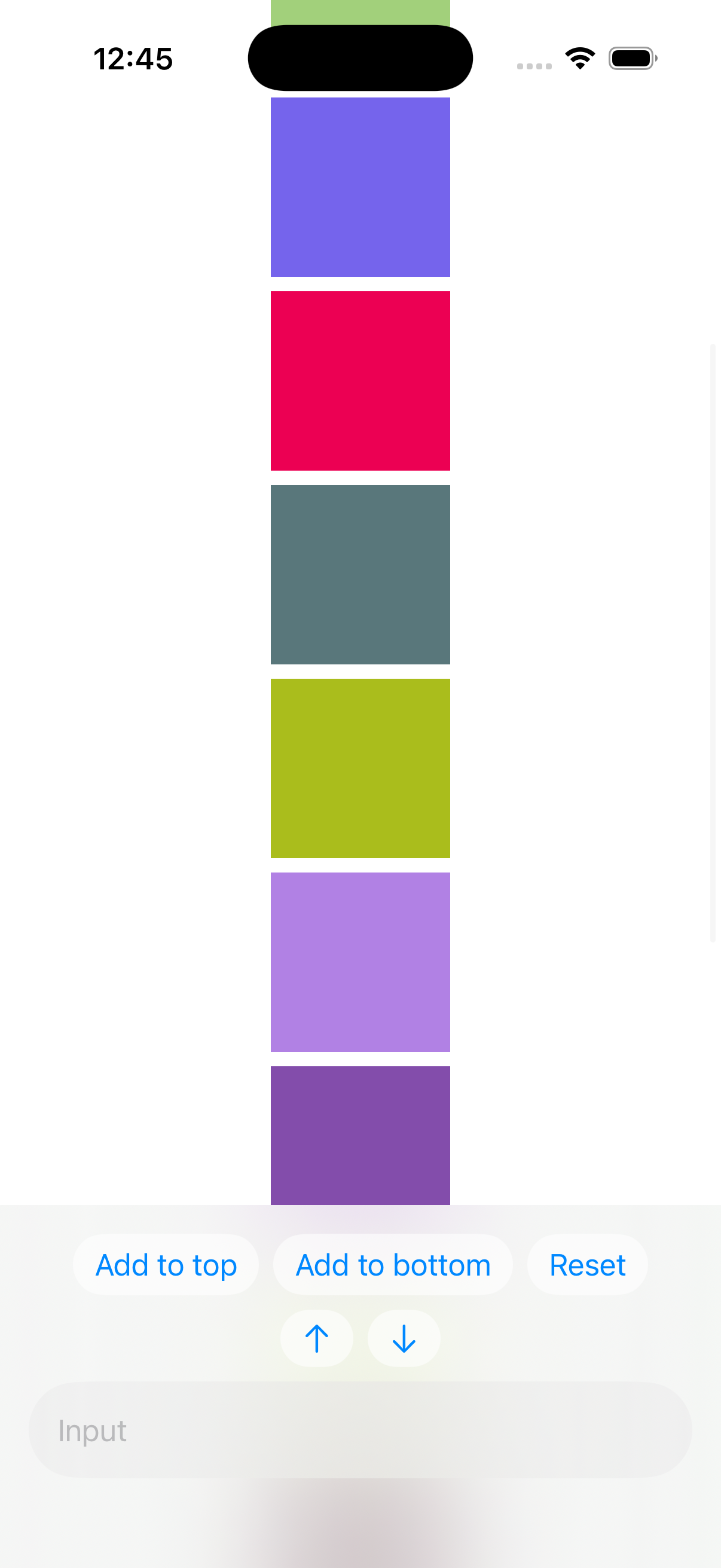 Everything works fine when the item height is fixed (e.g. colored squares), but when I switch to text views with variable height, the scroll position jumps and glitches—especially when the keyboard appears or disappears. This only happens on iOS 26, it works fine on iOS 18.