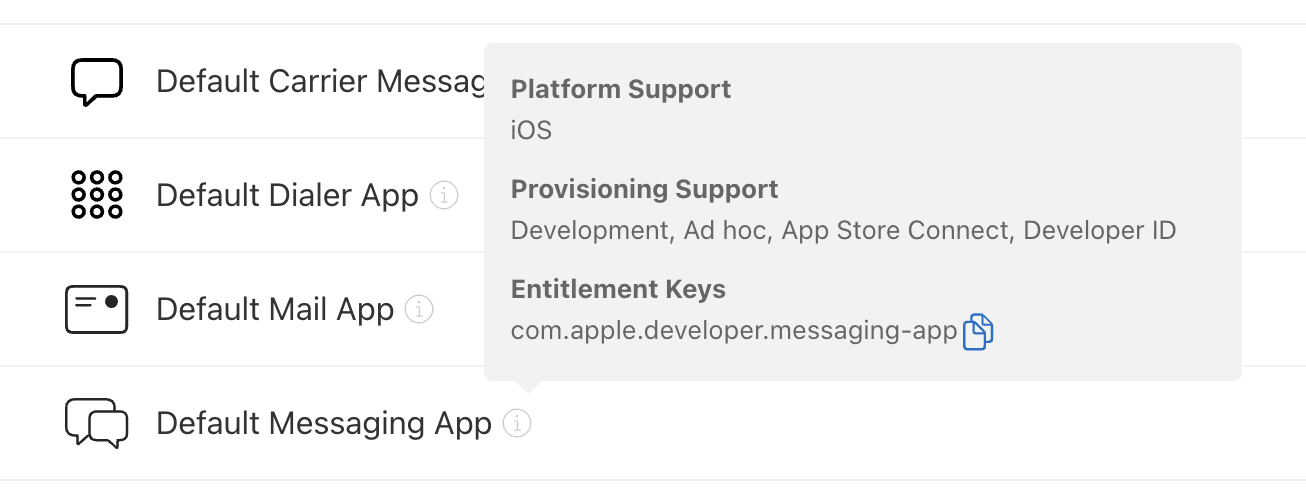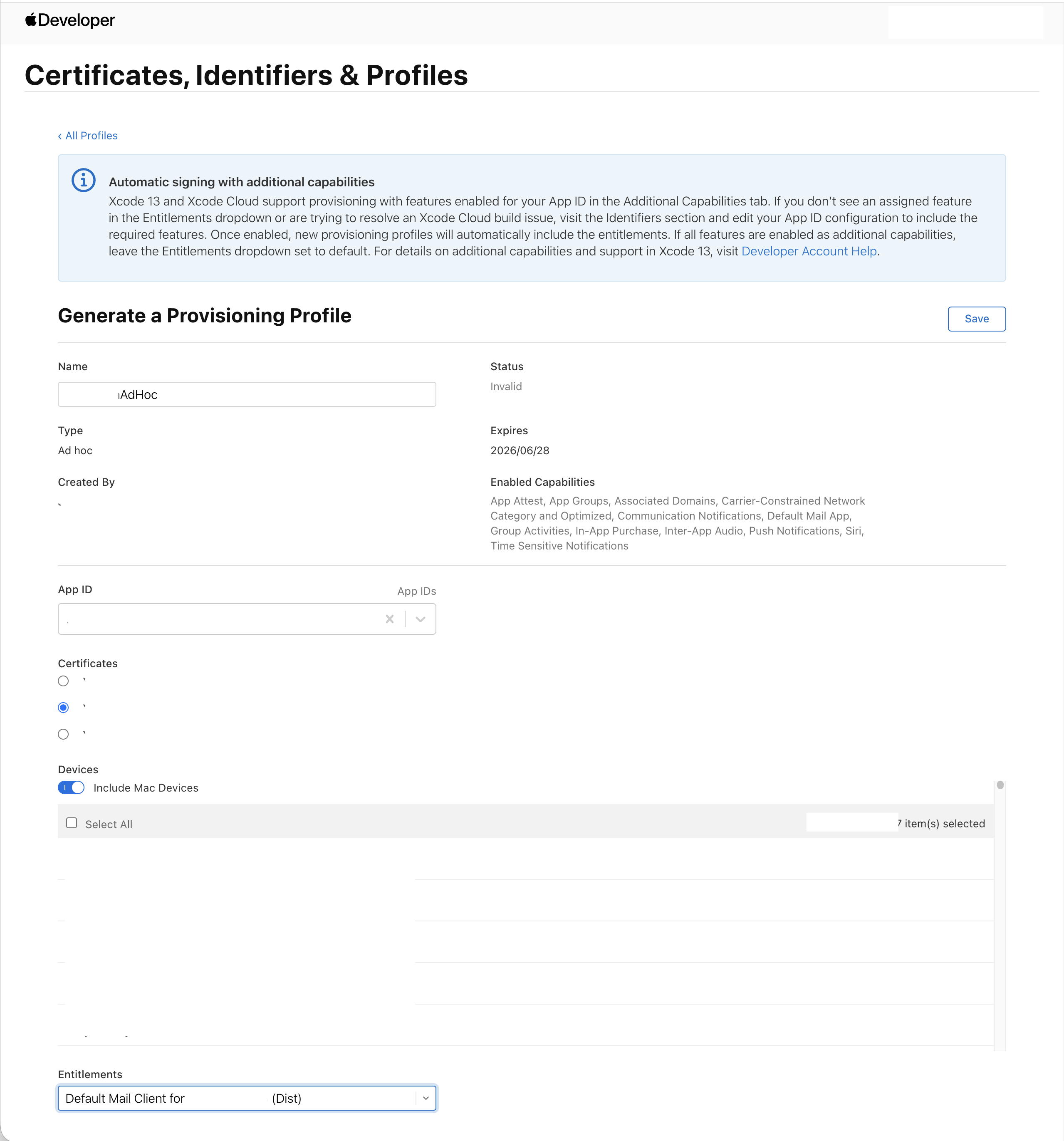 Another strange thing is that on the profile page for the ad hoc profile under "Enabled Capabilities" it shows "Default Mail App" (see screenshot above) but the capability/entitlement is missing from the downloaded profile unless I add it via the drop down menu on the profile page.