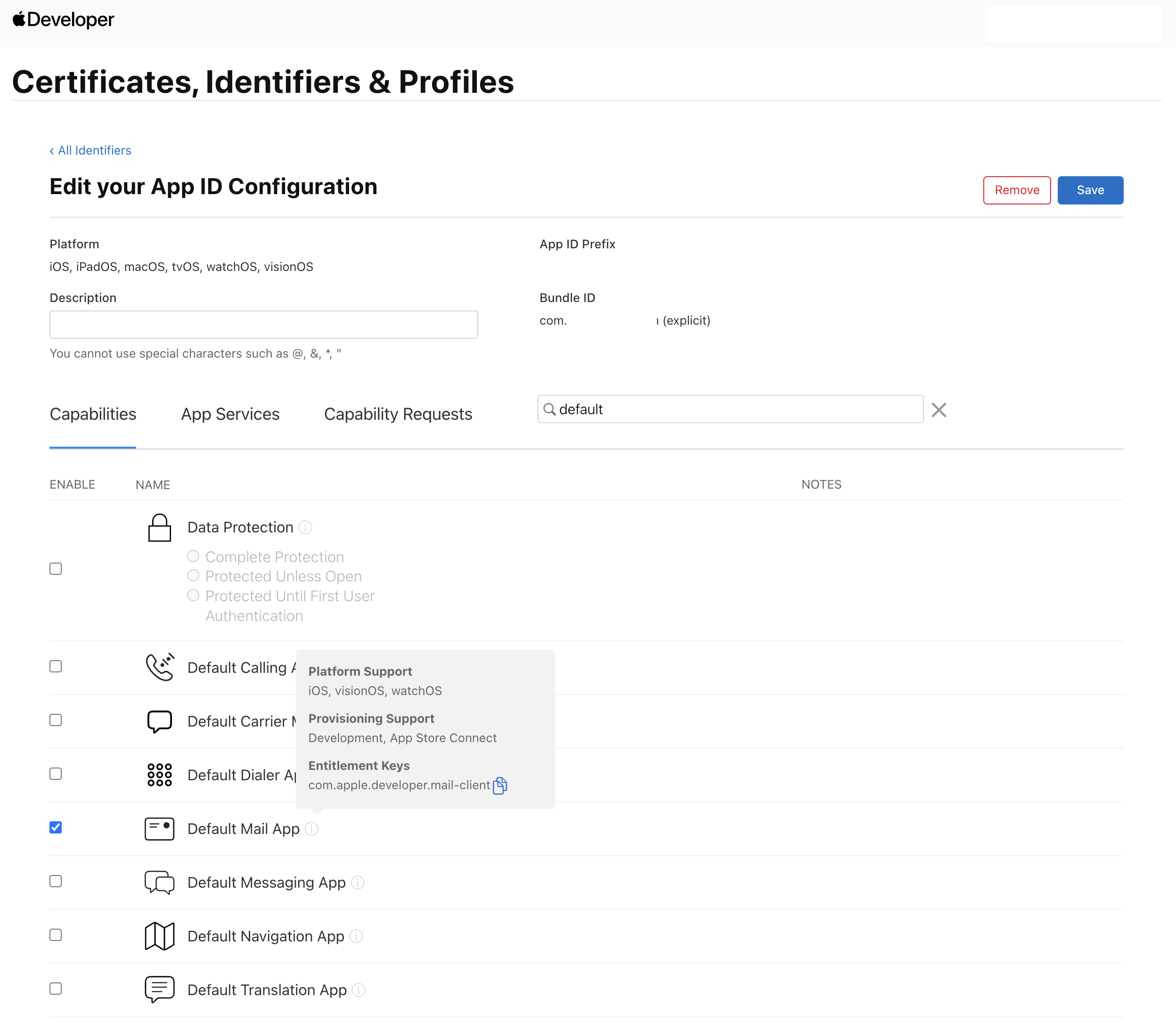 However, for some reason the "Default Mail App" capability (on the "Edit your App ID Configuration" screen) shows does NOT apply to Ad hoc profiles: