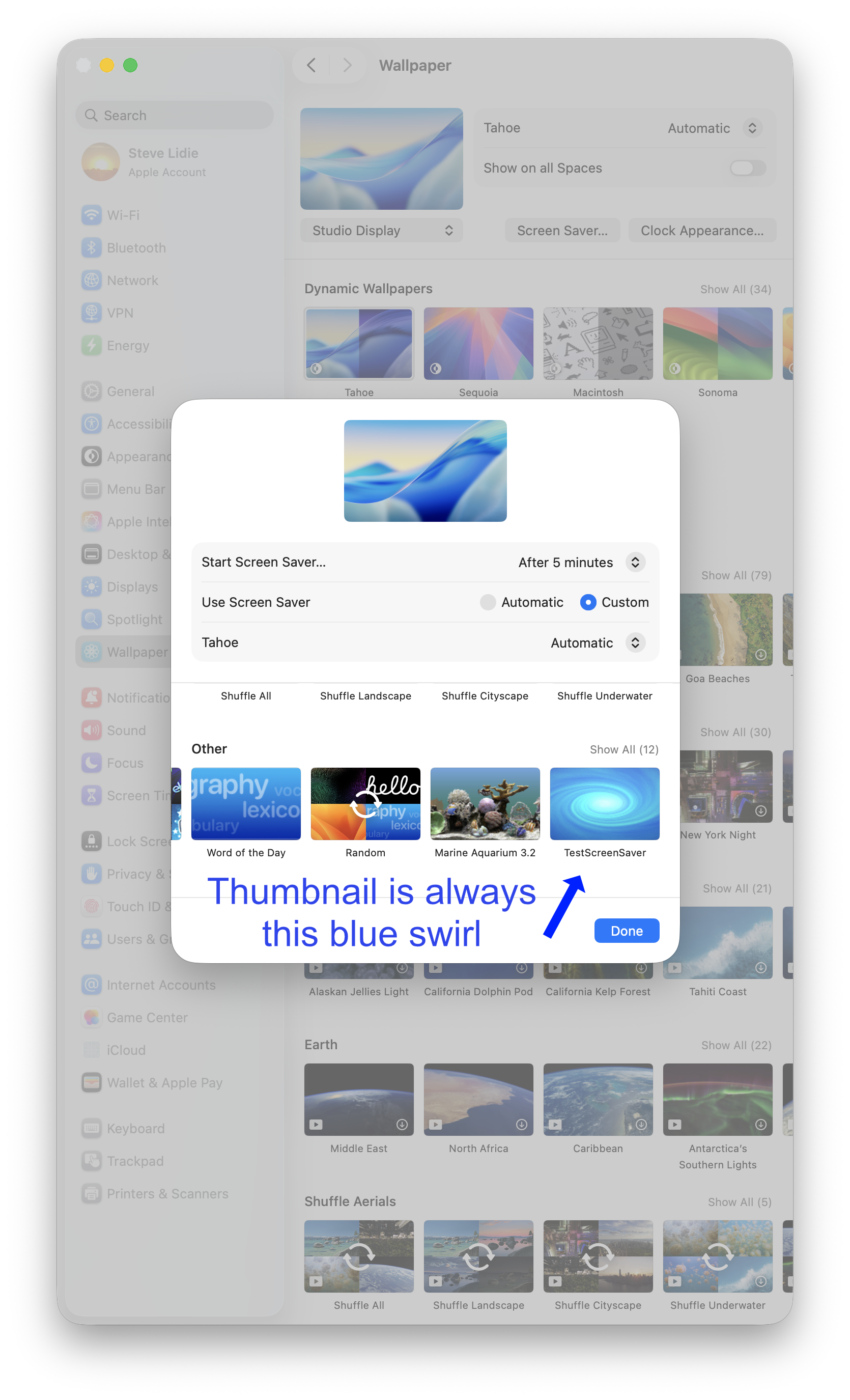 For the test saver in FB21094920 I was never able to set its icon/thumbnail, and it used the blue swirl (I assume) because nothing had ever been cached under that Saver’s name.