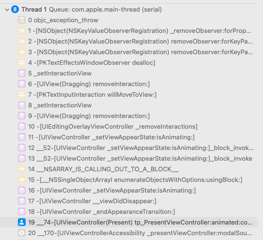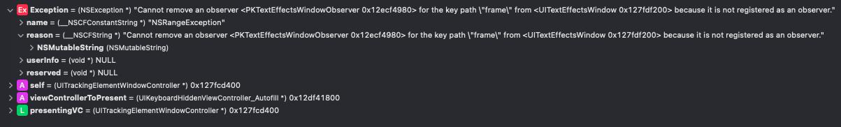 I have following code and made it invoke every time when a UIViewController presents another UIViewController through method swizzling. When I try to access the Password management app while input password, these code will be invoked and the presenting VC is instance of UITrackingElementWindowController. It will crash