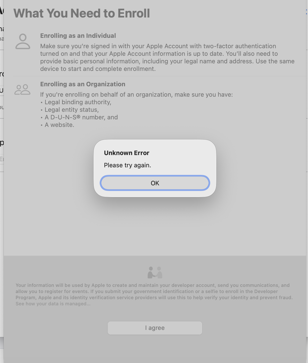 I'm trying to enroll in the Apple Developer Program for my current company. Everything seemed fine, but since yesterday, I keep encountering an 'Unknown Error' when I try to complete the enrollment.