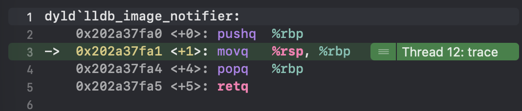 this is from the stack. #0 0x0000000207e0ffa1 in lldb_image_notifier () #1 0x0000000207e11c49 in dyld4::ExternallyViewableState::triggerNotifications () #2 0x0000000207e13a2f in invocation function for block in dyld4::ExternallyViewableState::notifyMonitorOfImageListChangesSim(bool, unsigned int, mach_header const**, char const**) () #3 0x0000000207e10c3b in dyld4::ExternallyViewableState::notifyMonitorOfImageListChangesSim () #4 0x00000001102b9195 in dyld4::ExternallyViewableState::triggerNotifications () #5 0x00000001102b9465 in dyld4::ExternallyViewableState::addImages () #6 0x000000011029dcec in dyld4::RuntimeState::notifyDebuggerLoad () #7 0x00000001102b8065 in dyld4::APIs::dlopen_from(char const*, int, void*)::$_0::operator()() const::'lambda'()::operator()() const () #8 0x00000001102b71fd in dyld4::APIs::dlopen_from(char const*, int, void*)::$_0::operator()() const () #9 0x00000001102b30e3 in dyld4::APIs::dlopen_from () #10 0x00000001199b4c5e in _CFBundleDlfcnLoadFramework () #11 0x0000000119982a1e in _CFBundleLoadExecutableAndReturnError () #12 0x0000000115f081c4 in -[NSBundle loadAndReturnError:] () #13 0x00000001a3c42866 in -[NSBundleAccessibility loadAndReturnError:] () #14 0x000000013cd67fa7 in __50-[AXCodeItem loadWithStrategy:onQueue:completion:]_block_invoke_2 ()