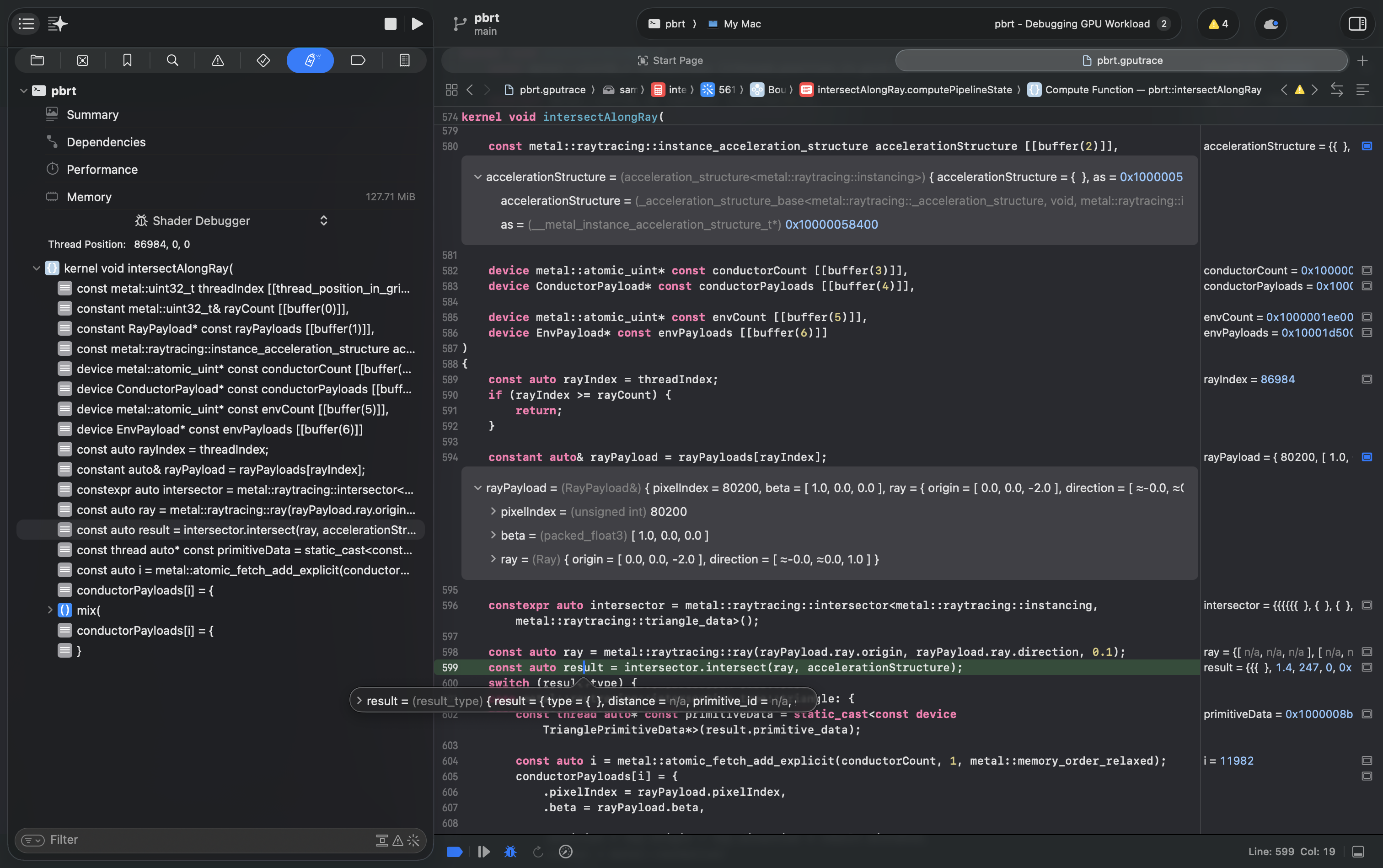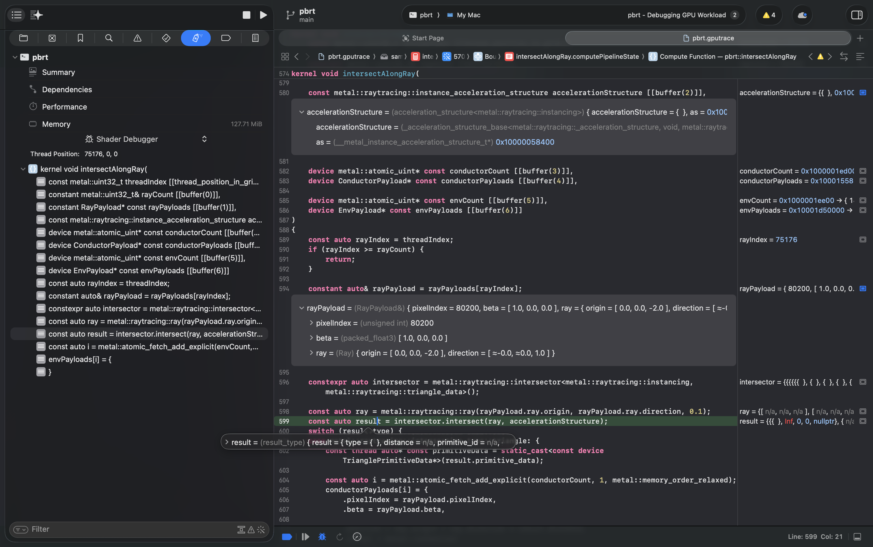 sampleCount) usingmetal::raytracing. - Intersection tests are performed using an IAS.