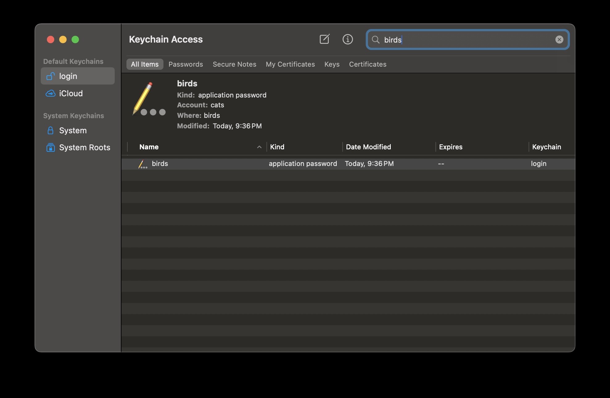 rickhedin@Ricks-MacBook-Pro zalando % security find-generic-password -s "birds" -wa "cats"
