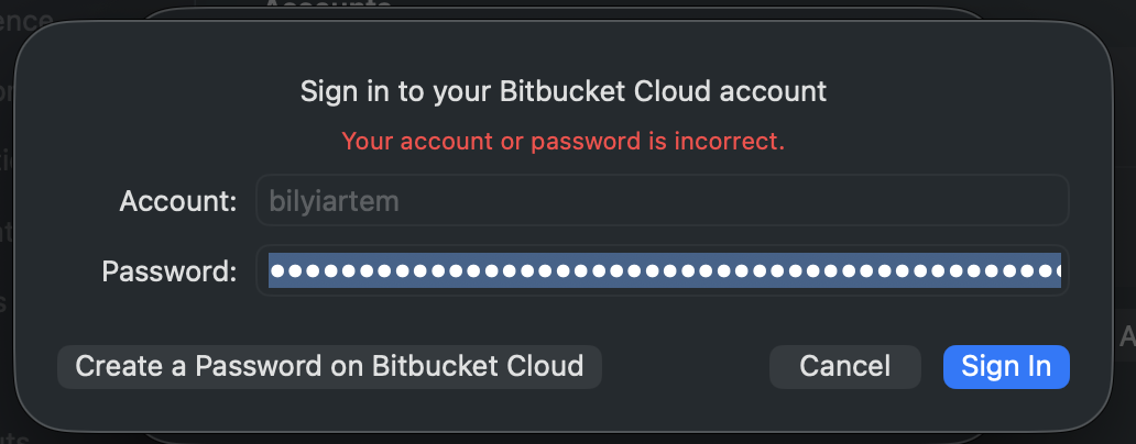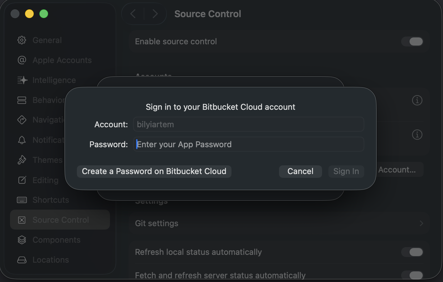 The problem most likely stems from the fact that Bitbucket has updated its policy, and the use of app passwords is no longer available (at least for new ones). However, in Xcode → Settings → Source Control, the login flow still requires an app password, which makes it impossible to authenticate using the new API tokens. Attempting to authenticate via SSH also does not resolve the issue.