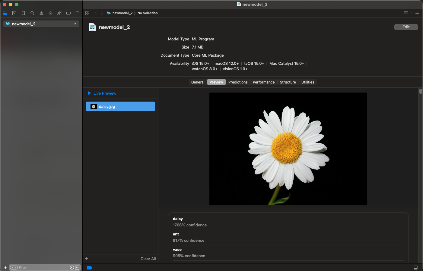 However when I view it in Xcode, the preview prediction percentage confidence is way off I suspect it is due the the output of the model, which is in percentage already and in Xcode it multiply 100 again leading to this result. Please give me any feedback to fix this, thank you.