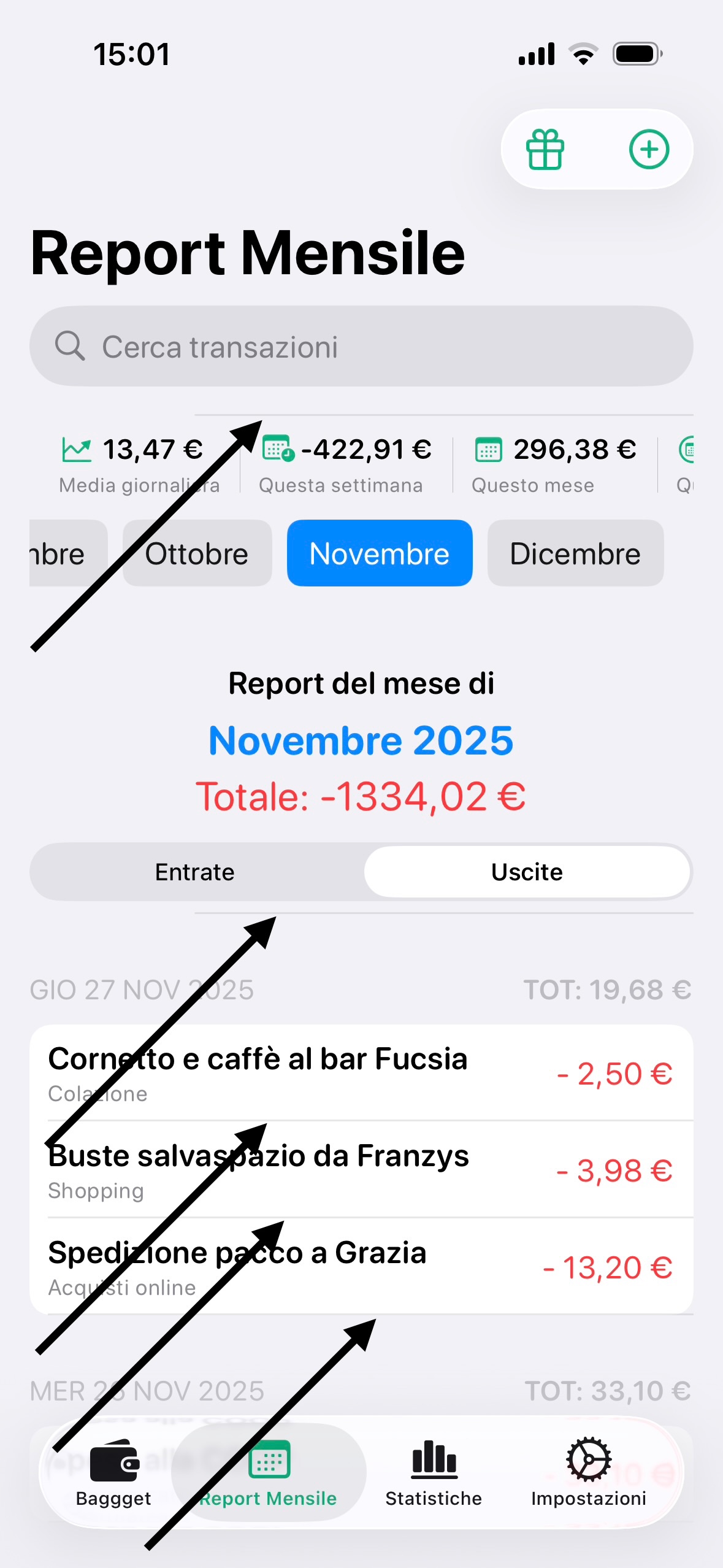 - a top block (statistics, month picker, year selector, total, Entrata/Uscita picker).