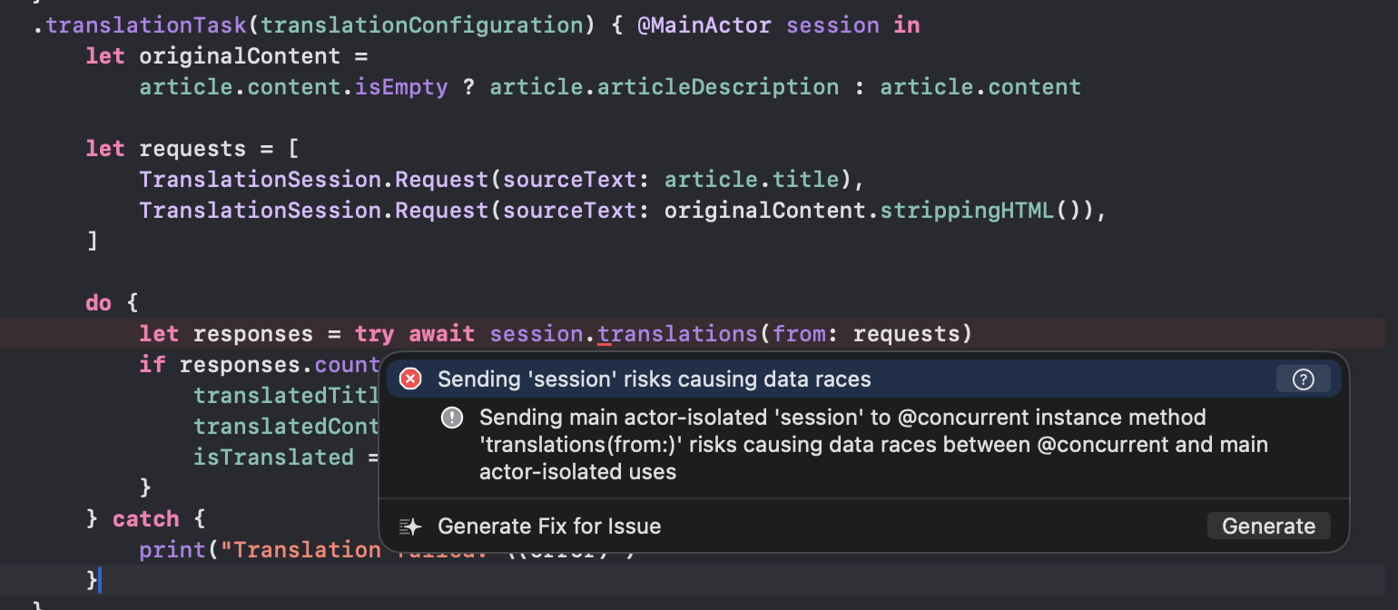 I encountered a concurrency compilation warning when calling the TranslationSession.translations(from: [TranslationSession.Request]) API, and I'm don't know how to resolve it. I reviewed the official demo, but it appears identical.