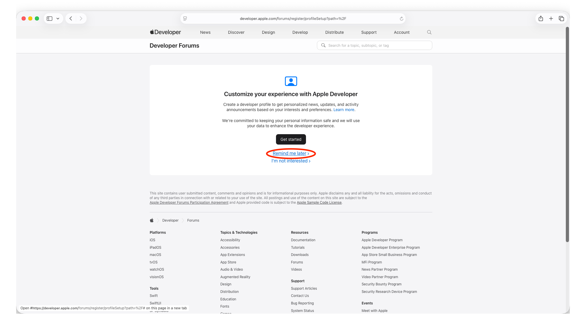 The "Remind me later" button doesn't work on the "Customize your experience with Apple Developer" page on the Developer Forums. It just redirects me back to the same page.