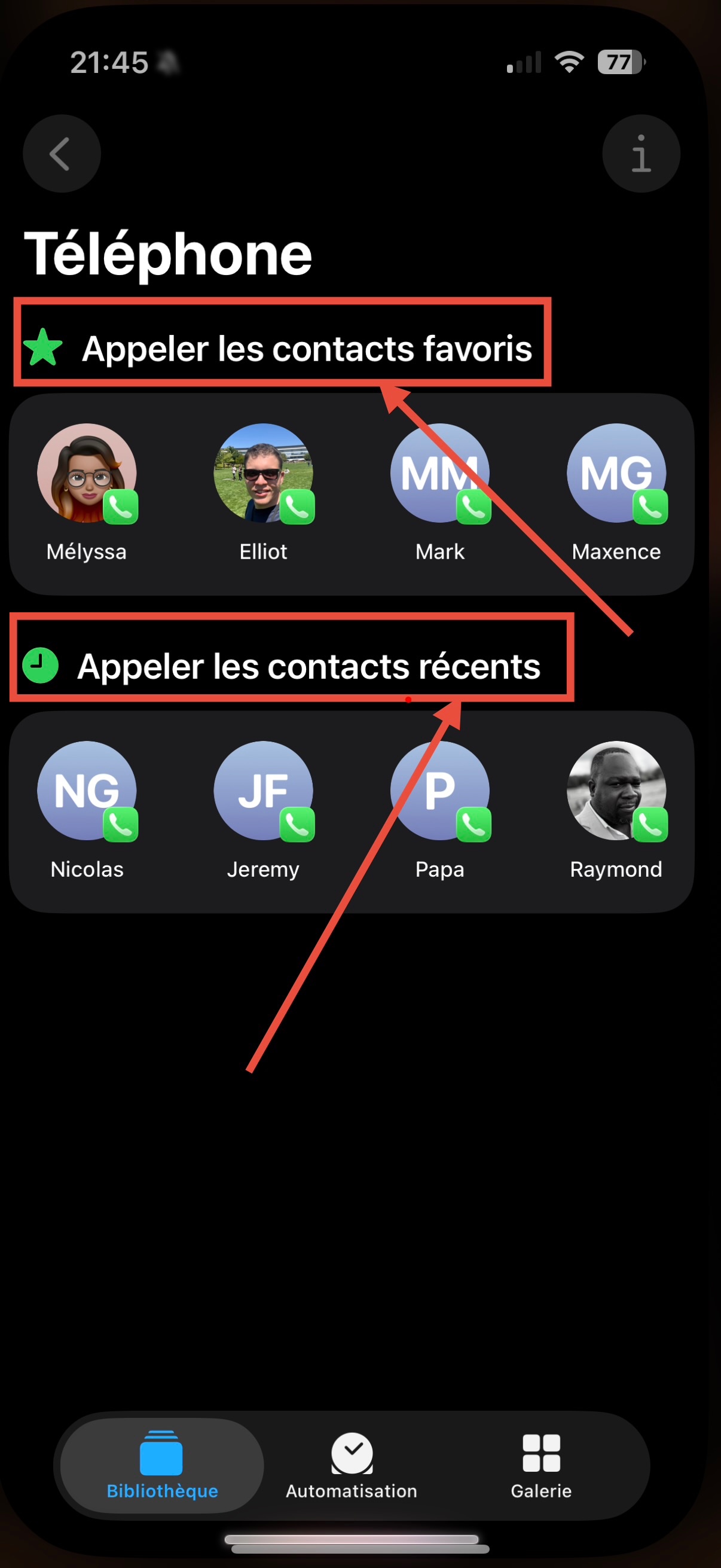 For example, in the Phone shortcut, there are built-in sections such as “Call Favorite Contacts” and “Call Recent Contacts” (see screenshot attached).