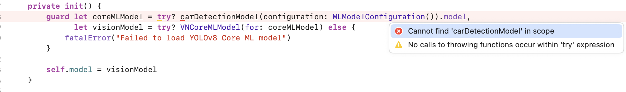 Hi everyone, I’m working on an iOS app that uses a Core ML model to run live image recognition. I’ve run into a persistent issue with the mlpackage not being turned into a swift class. This following error is in the code, and in carDetection.mlpackage, it says that model class has not been generated yet. The error in the code is as follows:
