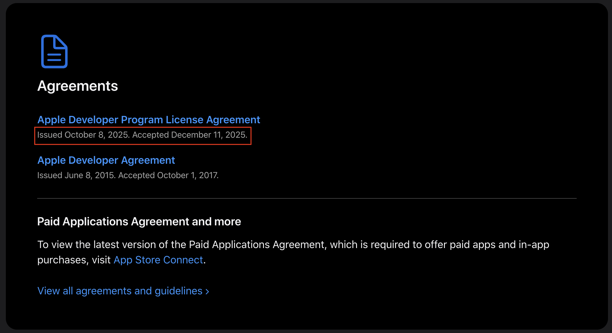 1. Agreement Status on developer.apple.com: I successfully accepted and reviewed the updated agreement at https://developer.apple.com/account. The Agreements section confirms the acceptance date as December 11, 2025 (as seen in the attached image).