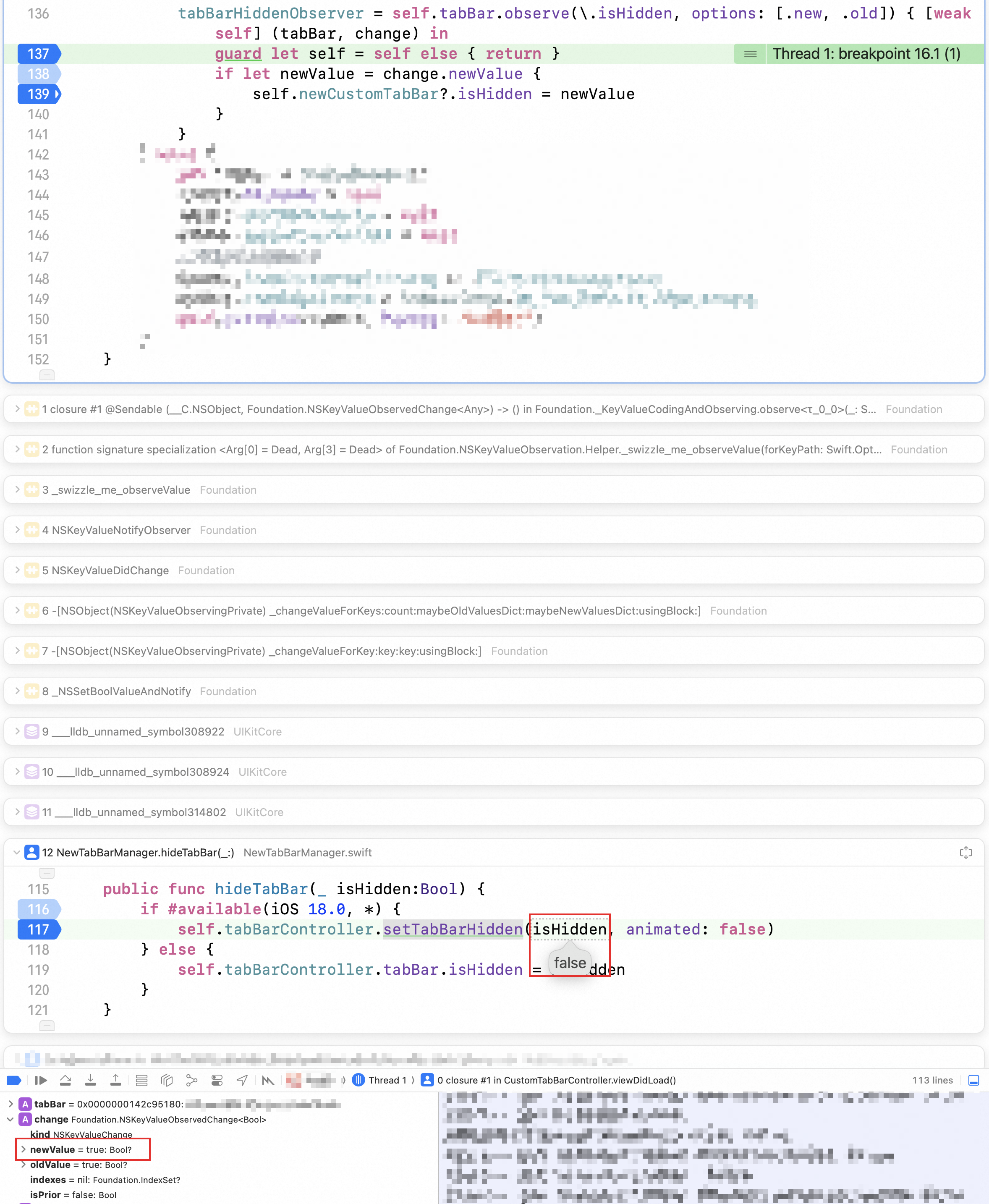 When I called the setTabBarHidden method and passed in false, I found in the KVO callback of the tabBar.isHidden property that the value of newValue was true. Why are the values of the two different? Is this a bug?