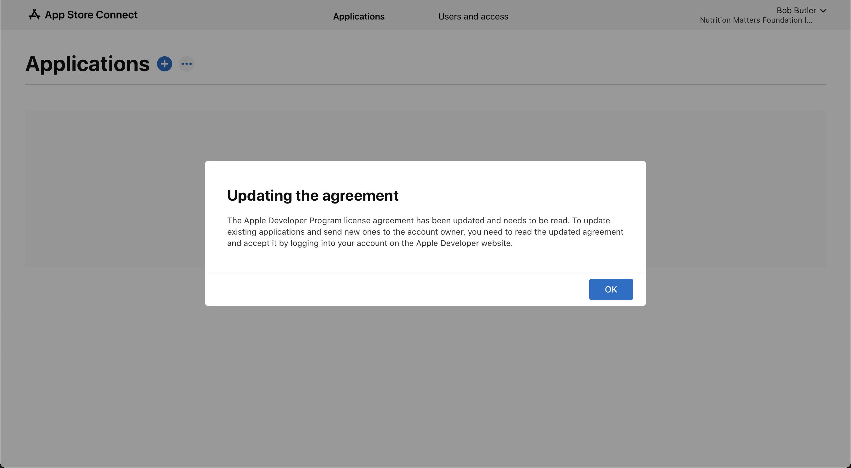 For some reason, I can't add the app to the appstore connect. Can't understand what happened, what the license this popup talking about.