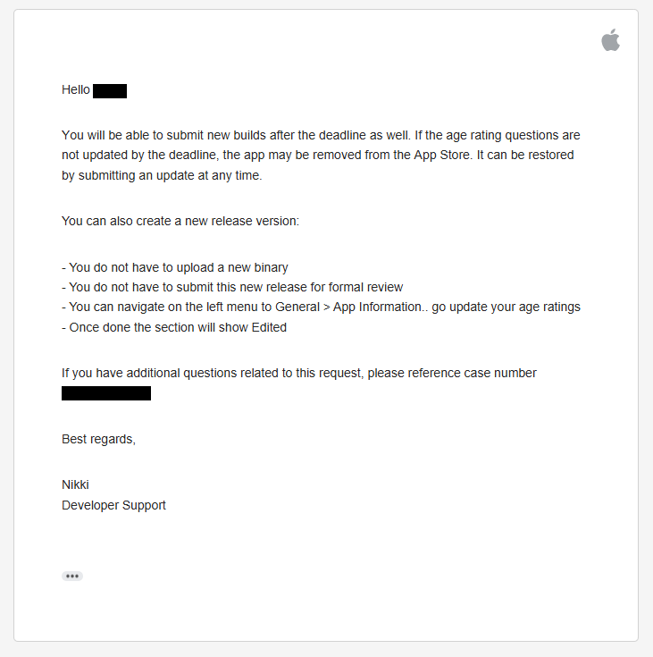 Thanks for sharing. The reply says when you not update the age rating the app might be removed. That's something new which nowhere was written before.