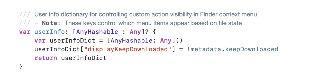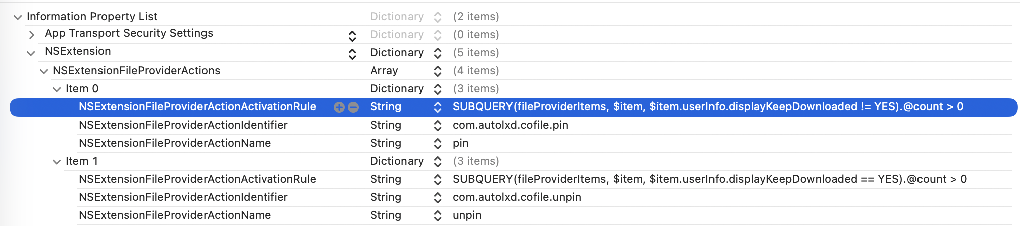 On the macOS platform, I am planning to use the combination of NSFileProviders Custom Action and userInfo to implement custom context menus. However, the NSExtensions FileProviders Action Activation Rule in info does not work as long as it is related to userInfo. Are there any restrictions on the use of this userInfo? keepDownloaded is bool value