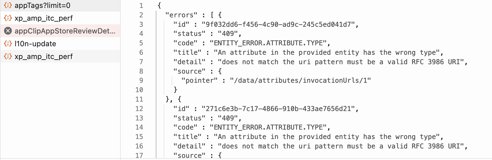 The Error Log: { "errors" : [ { "id" : "9f032dd6-f456-4c90-ad9c-245c5ed041d7", "status" : "409", "code" : "ENTITY_ERROR.ATTRIBUTE.TYPE", "title" : "An attribute in the provided entity has the wrong type", "detail" : "does not match the uri pattern must be a valid RFC 3986 URI", "source" : { "pointer" : "/data/attributes/invocationUrls/1" } } ] } Conflicting Status: Interestingly, the exact same URL has already been configured under Advanced App Clip Experiences, where it currently shows a status of "Received".