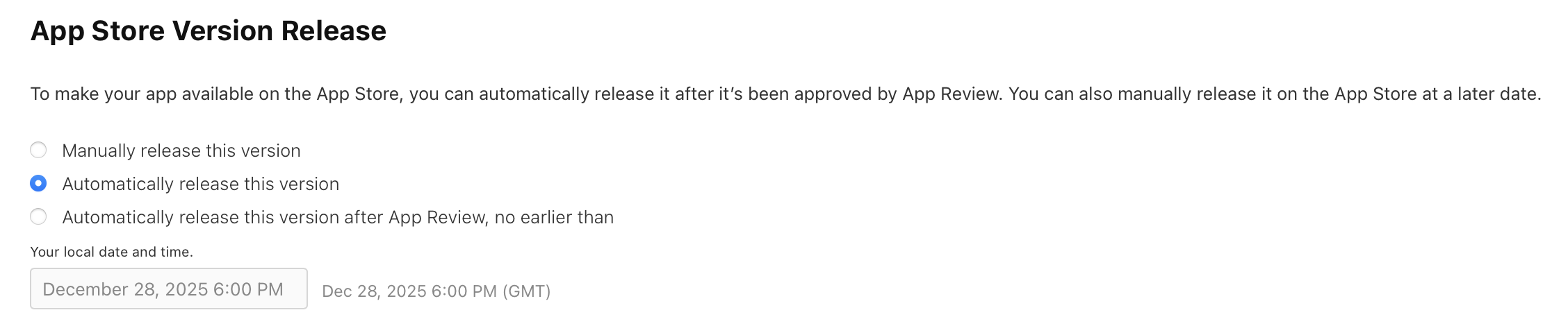 I want to publish my game next year in the Apple App Store but I want to choose the time period manually. Can I upload my game for app review without releasing it automatically afterwards? Where exactly can I choose in App Store Connect if my game is published automatically or manually after the app review process? Currently I only use TestFlight.