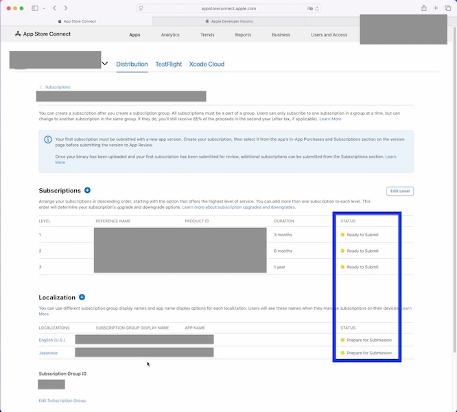 He or she says that the Prepare for Submission status for the localization options only suggests that the subscription group isn't submitted for the review and isn't approved. That's a terribly bad design.