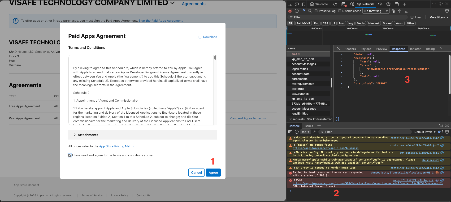 After that, Apple introduced new terms and conditions. When we tried to accept them, the account status did not change at all. I clicked “Accept” many times, but it remained in pending status. When I checked the browser console (F12), I noticed that Apple was returning a 500 error, but this error was not shown anywhere in the UI.