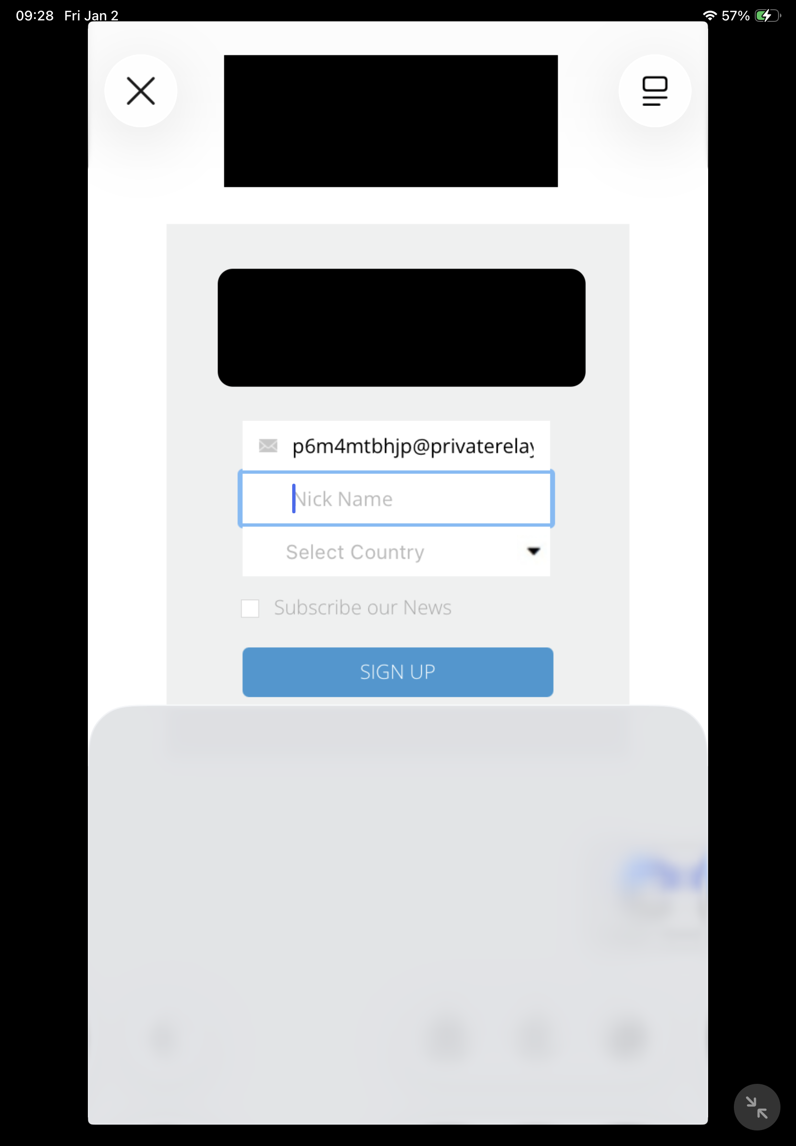 The problematic screen presents a sign-up web page using SFSafariViewController
