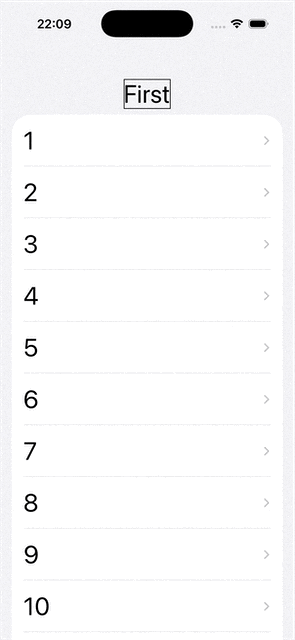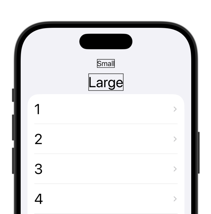 struct ContentView: View { var body: some View { NavigationStack { Screen() .navigationTitle("First") .toolbar { ToolbarItem(placement: .largeTitle) { Text("First") .font(.largeTitle) .border(Color.black) } } .navigationDestination(for: Int.self) { integer in DestinationScreen(integer: integer) } } } }