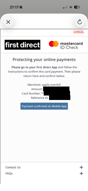 after going through the typical purchase flow (tapping the button to trigger the in-app purchase sheet, completing Face ID) they see this verification sheet appear over my app and have to go to their banking app to approve the purchase.
