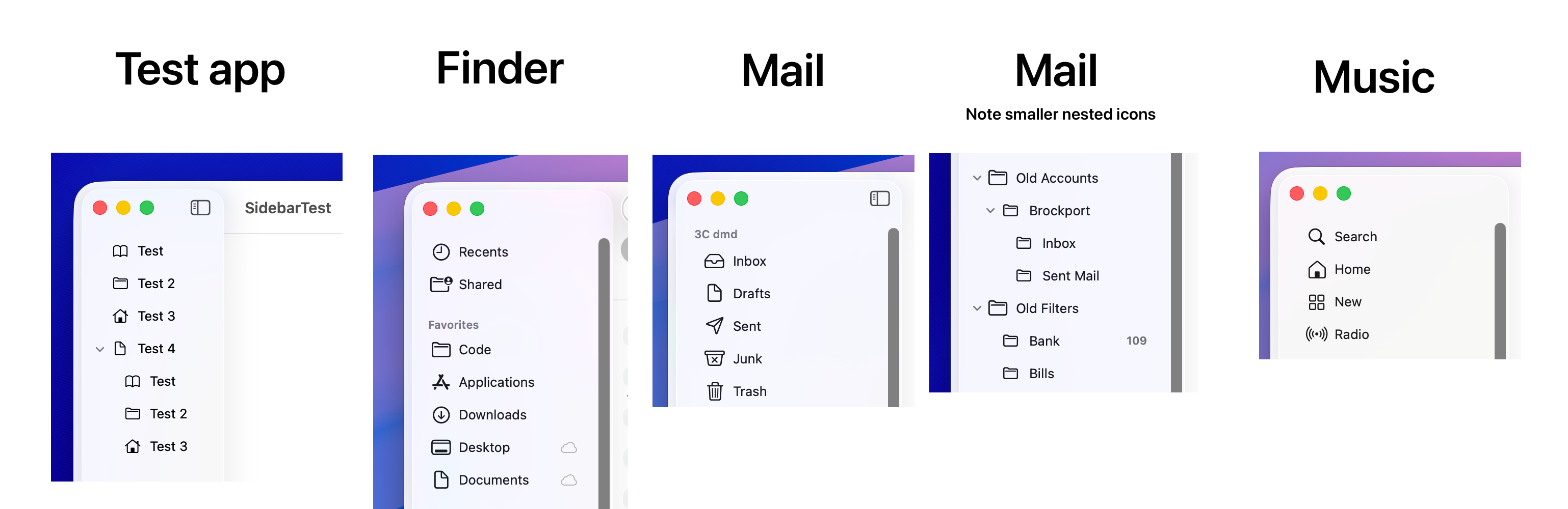 If you visually compare the resulting sidebar with any built-in macOS app (Finder, Notes, Mail, Music, etc.) the built-in apps all have larger icons and the spacing is different from my SwiftUI app, which has too small icons and (I think) wrong spacing.