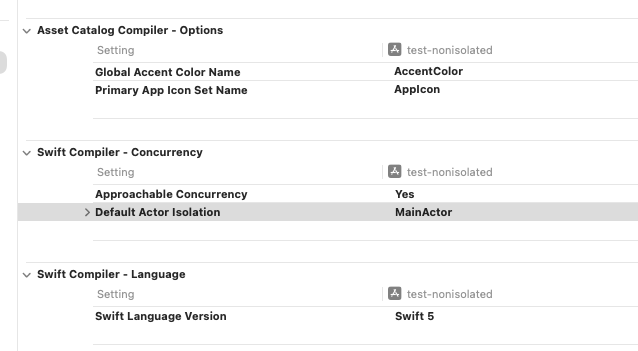 However, starting with Xcode 26.2, Apple introduced the Swift Compiler – Concurrency settings.