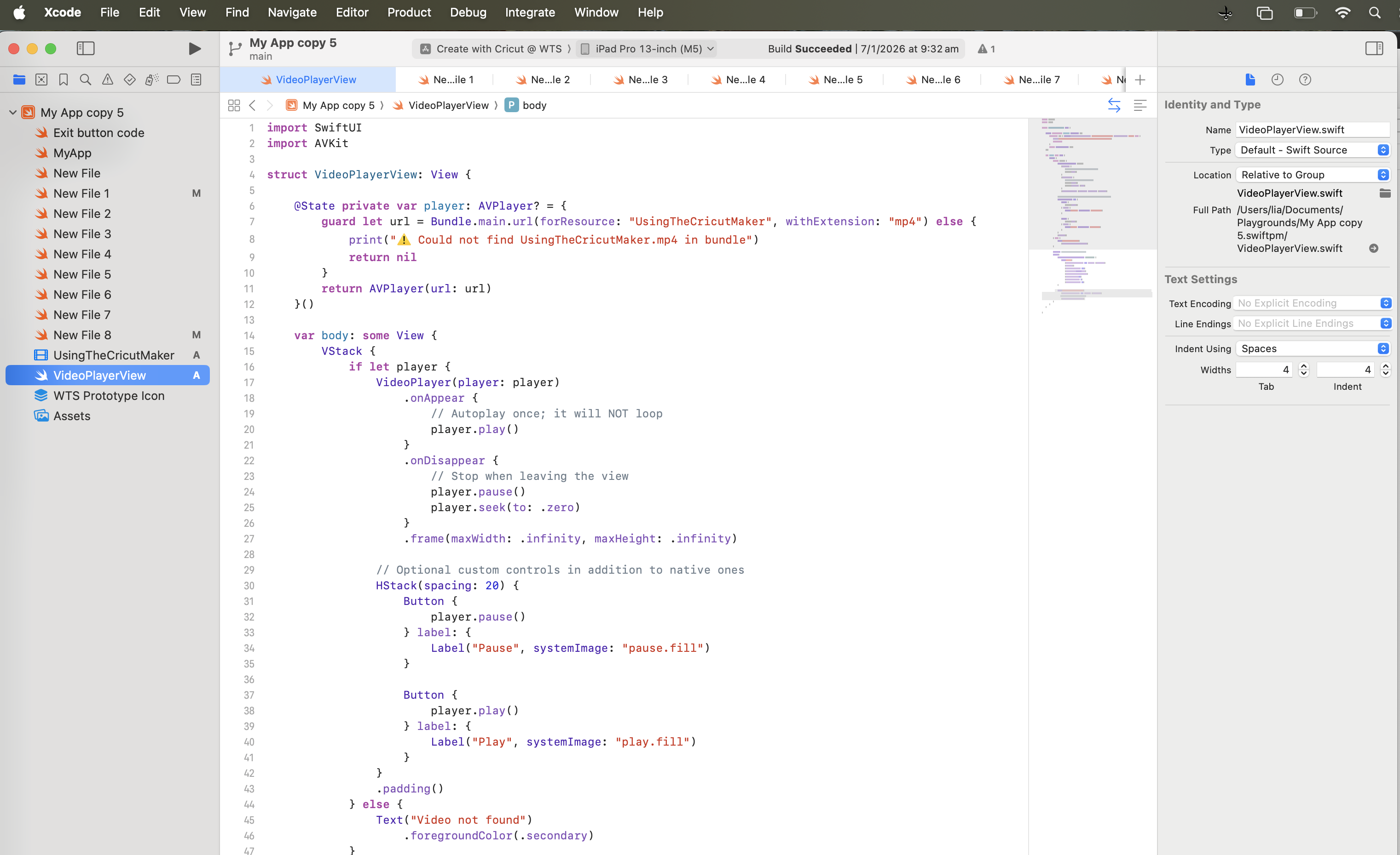 My video file is located in the navigator pane, along with the other swift files in the project, with an A to the right hand side of the file, which I thought means it is available in the bundle. Unfortunately, an error saying the video cannot be found in the bundle shows at the bottom of my Xcode screen, after previewing the project. The file names match. Any further trouble shooting I'm doing references the old Xcode app, so I am stuck.