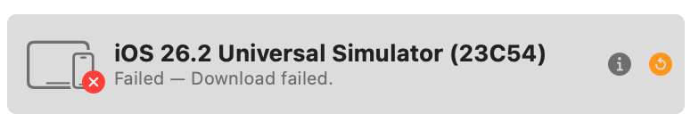 Failed fetching catalog for assetType (com.apple.MobileAsset.iOSSimulatorRuntime), serverParameters ({ RequestedBuild = 23C54; }) Domain: DVTDownloadsUtilitiesErrorDomain Code: -1