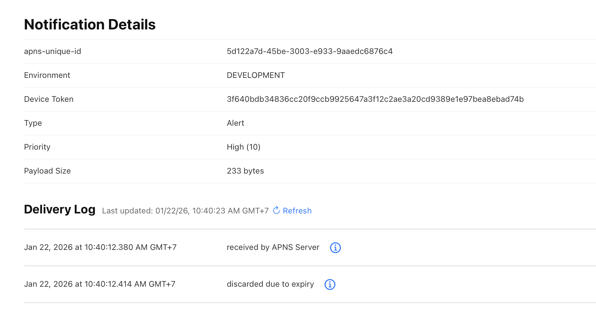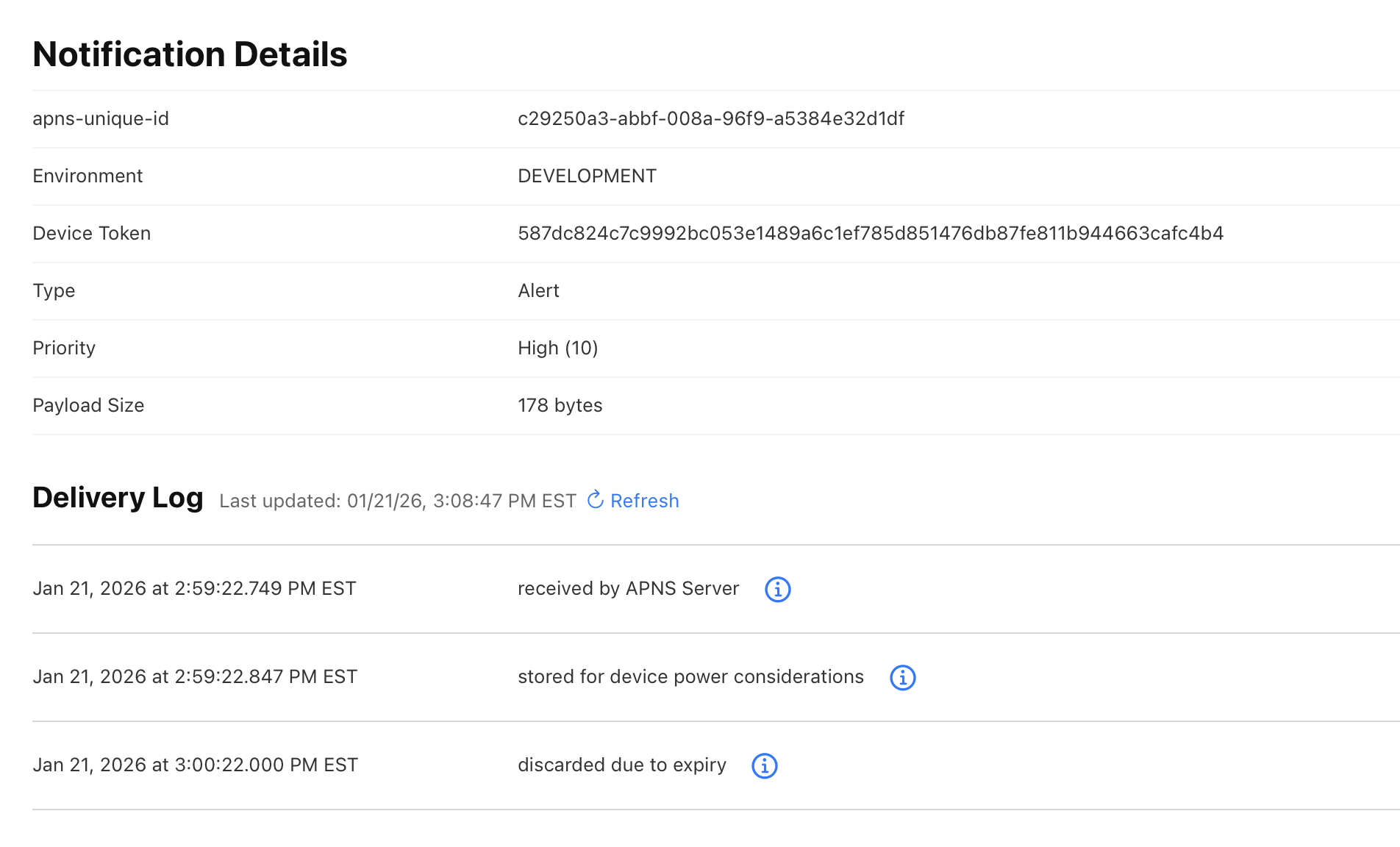 Other team members have had similar problems but less reliably broken and even get a "stored for device power considerations" message followed by discarded (see apns-unique-id c29250a3-abbf-008a-96f9-a5384e32d1df).