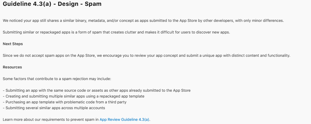 I've been rejected by Apple many times for design spam. I'm confused whether this is because I'm reusing codebase or because my app is similar to other apps on the store. However, very few other apps on the App Store are similar to mine, so I don't think I'm spamming. Could you please tell me how to fix this? Should I refect the codebase or completely redesign the app's features? Thank you for reading!